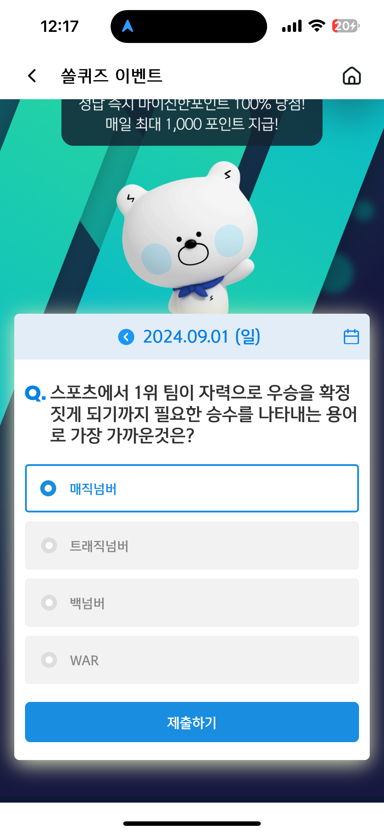신한 슈퍼SOL 야구/상식 쏠퀴즈 정답은 매직넘버 입니다