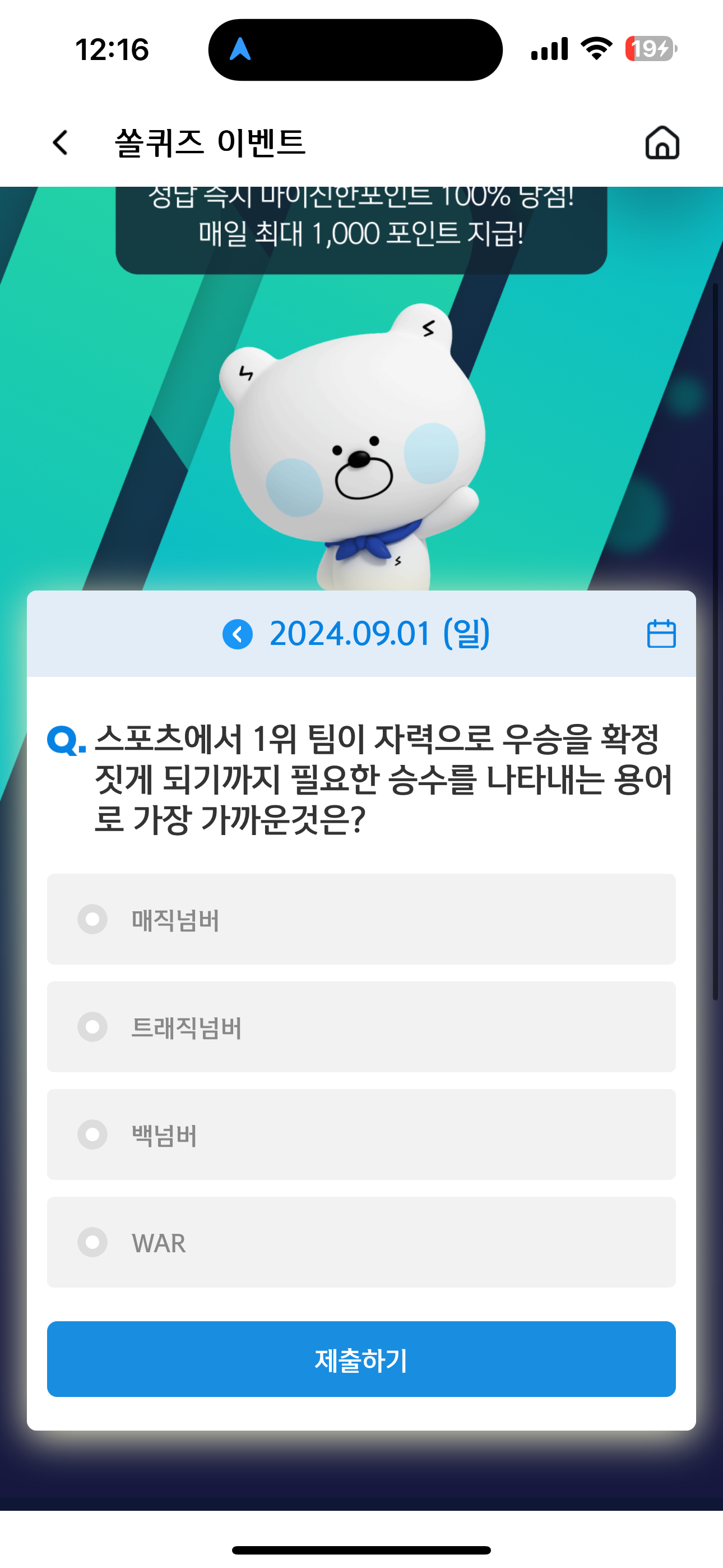 신한 슈퍼SOL 야구/상식 쏠퀴즈 9월 1일 문제입니다
