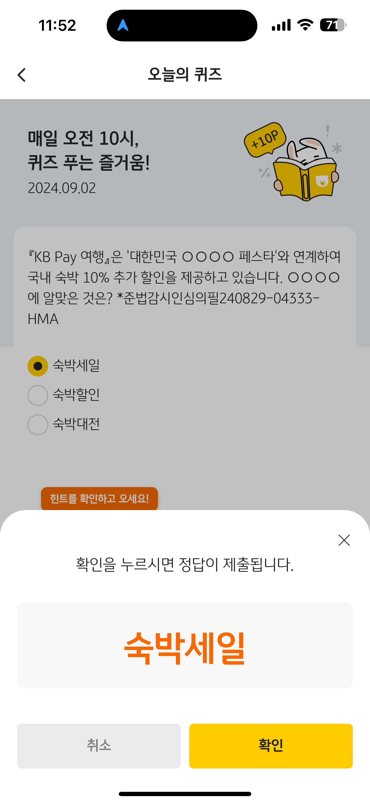 KB Pay 오늘의 퀴즈 정답은 숙박세일 입니다