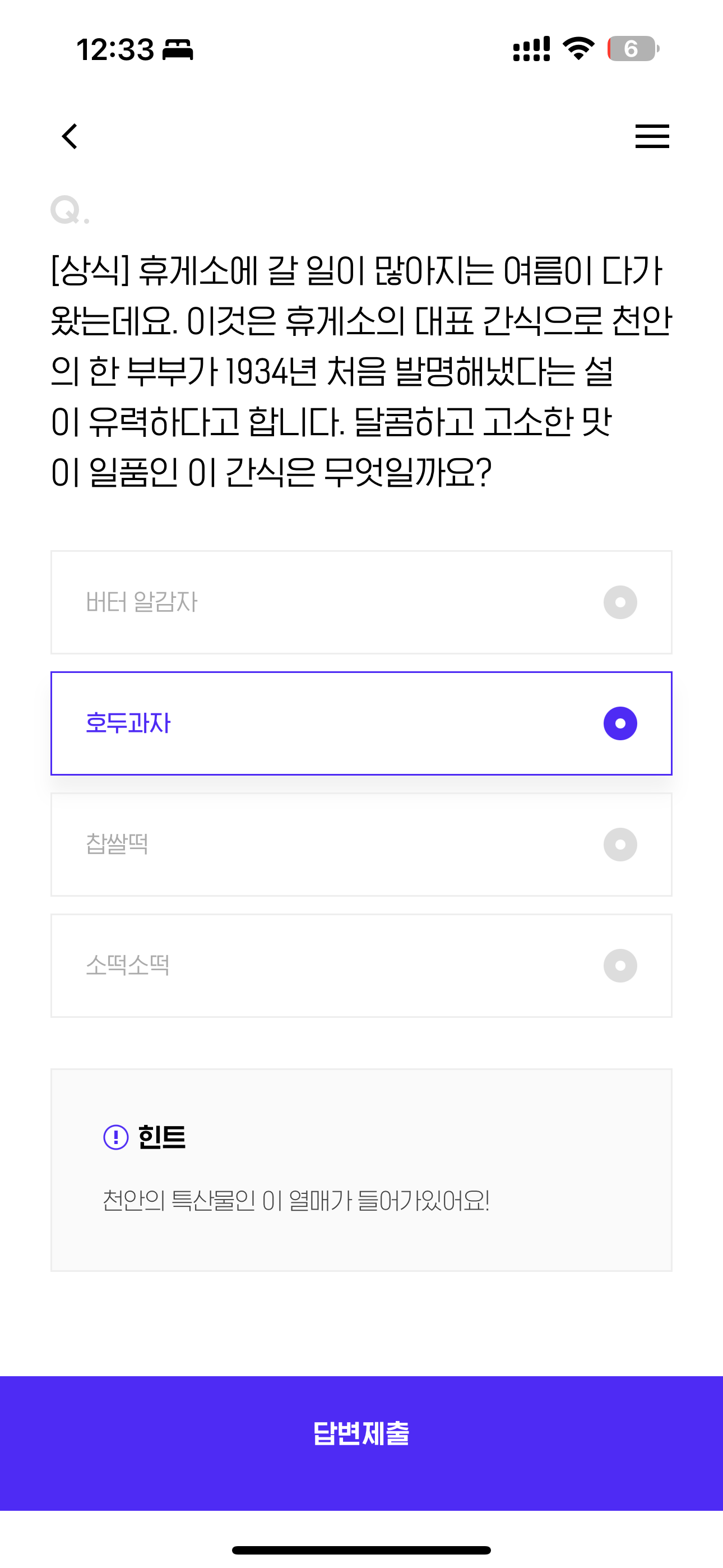[상식] 휴게소에 갈 일이 많아지는 여름이 다가왔는데요. 이것은 휴게소의 대표 간식으로 천안의 한 부부가 1934년 처음 발명해냈다는 설이 유력하다고 합니다. 달콤하고 고소한 맛이 일품인 이 간식은 무엇일까요? 보기는 1. 버터 알감자 2. 호두과자 3. 찹쌀떡 4. 소떡소떡 입니다.