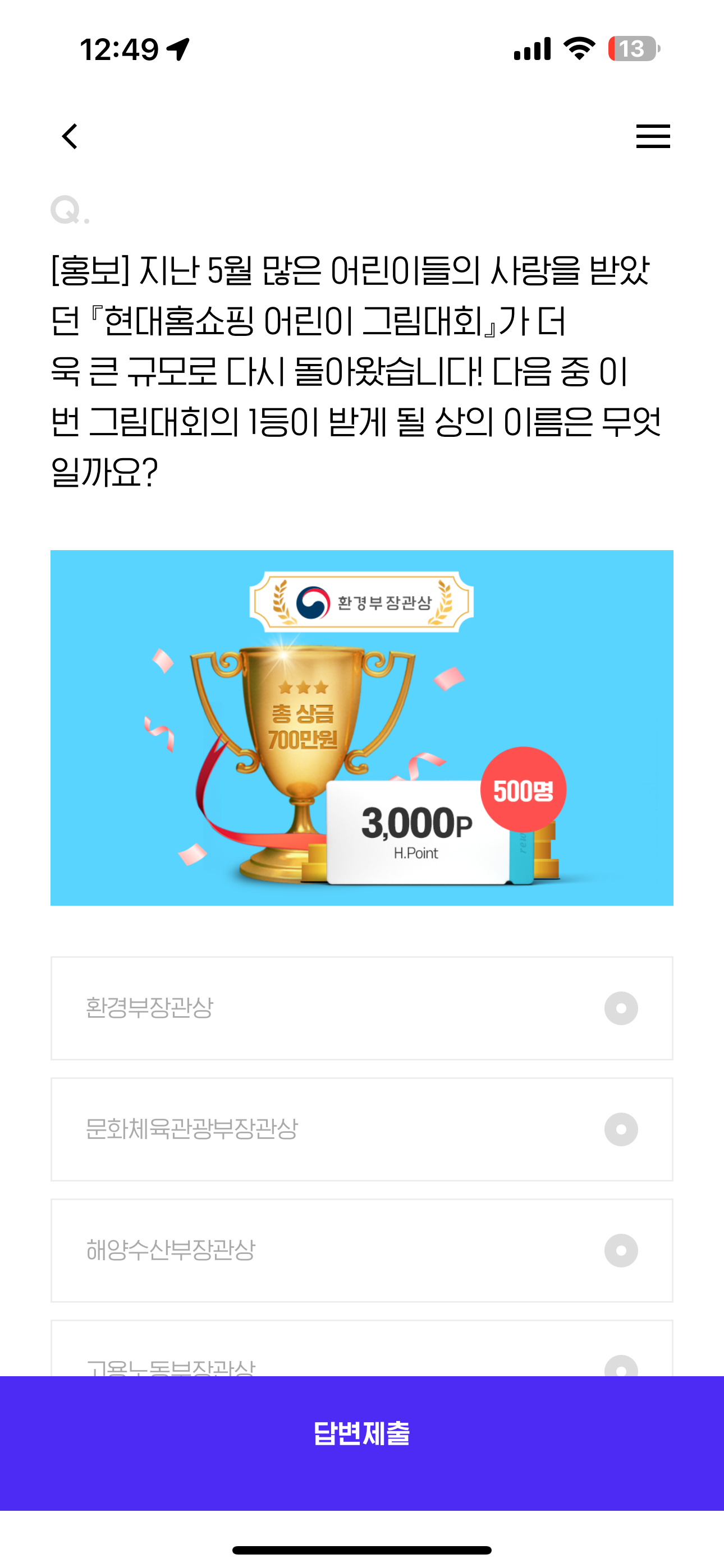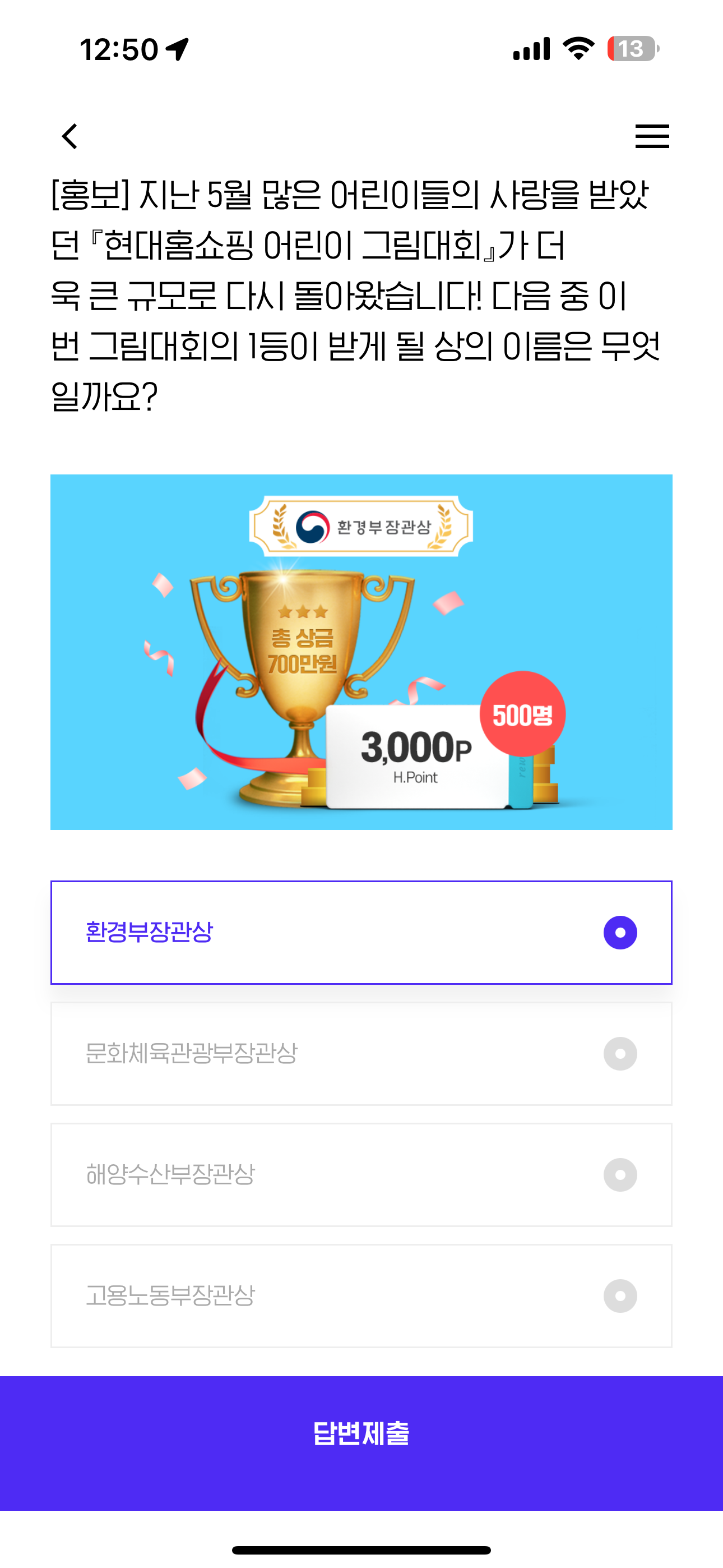 H포인트 퀴즈 정답은 환경부장관상 입니다