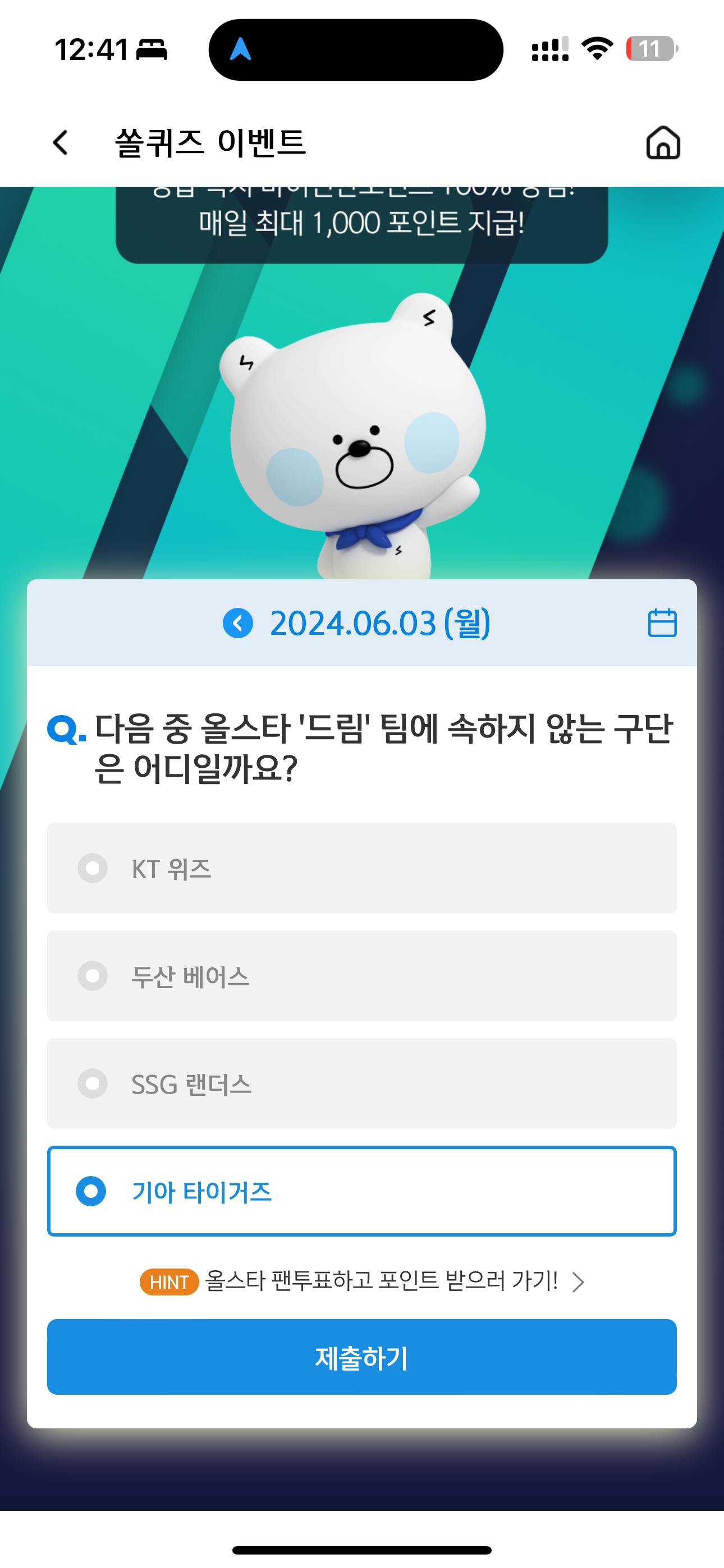 신한 슈퍼SOL 야구/상식 쏠퀴즈 정답은 기아 타이거즈 입니다