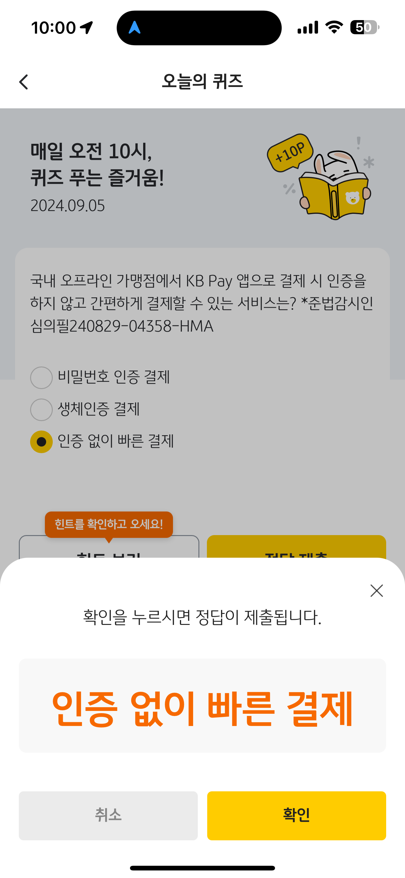 KB Pay 오늘의 퀴즈 9월 5일 정답(국내 오프라인 가맹점에서 KB Pay 앱으로 결제 시 인증을 하지 않고 간편하게 결제할 수 있는 서비스는?)