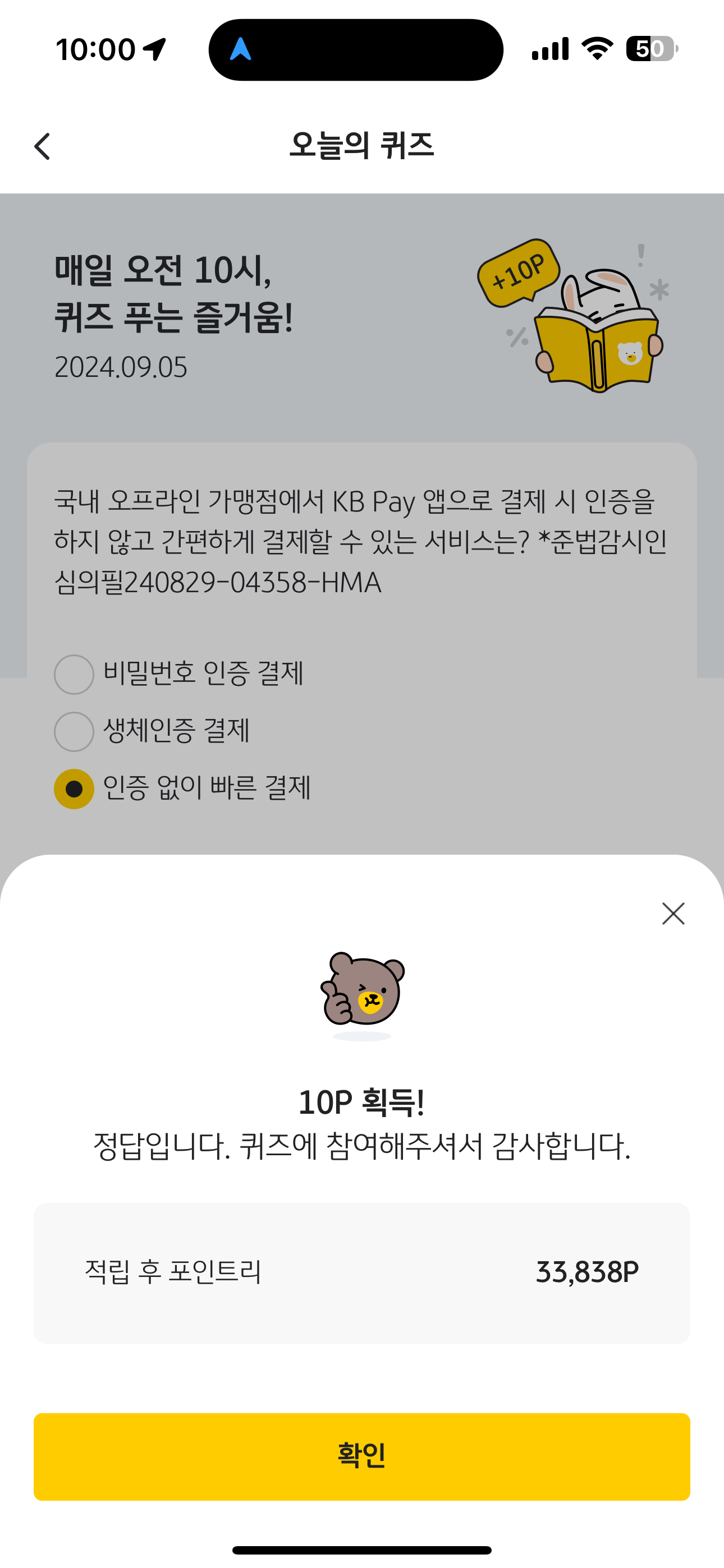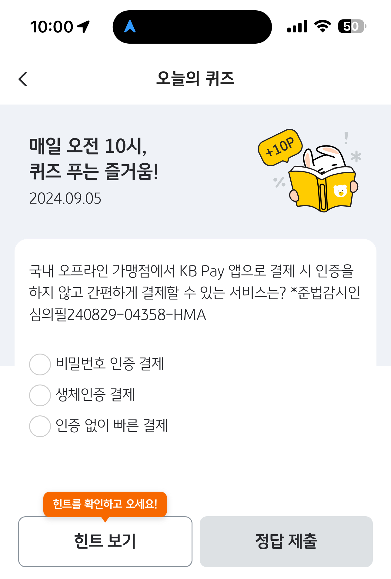 KB Pay 오늘의 퀴즈 정답은 인증 없이 빠른 결제 입니다