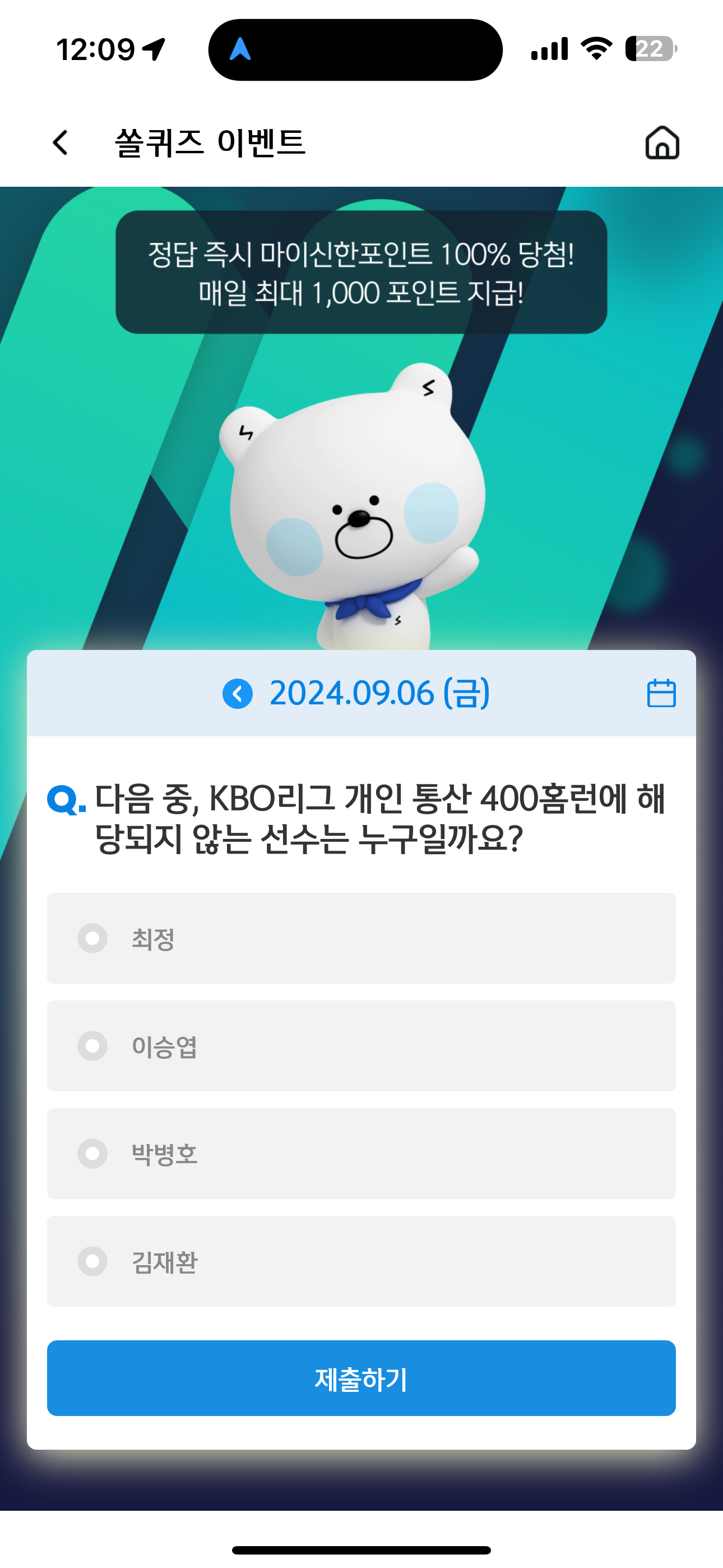 신한 슈퍼SOL 야구/상식 쏠퀴즈 9월 6일 문제입니다