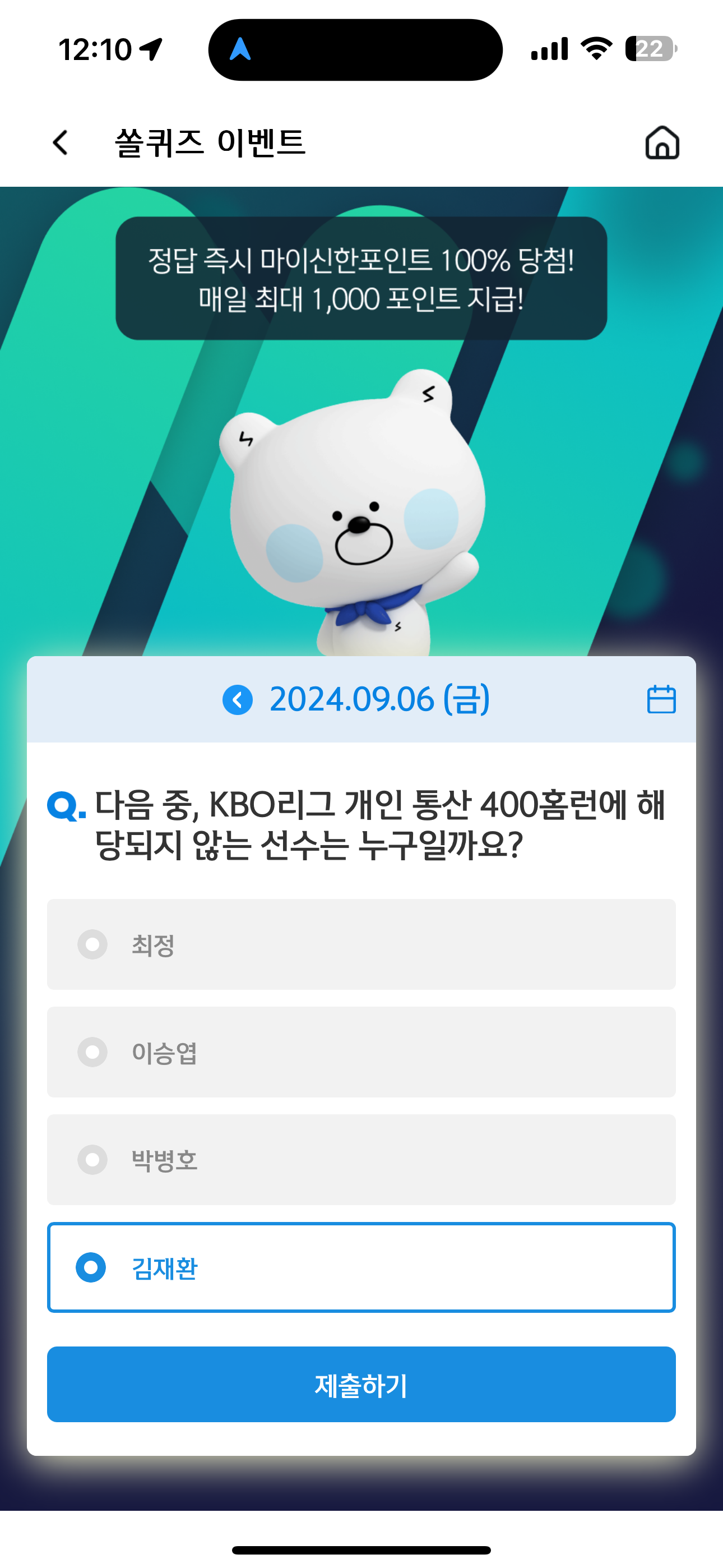 신한 슈퍼SOL 야구/상식 쏠퀴즈 정답은 김재환 입니다