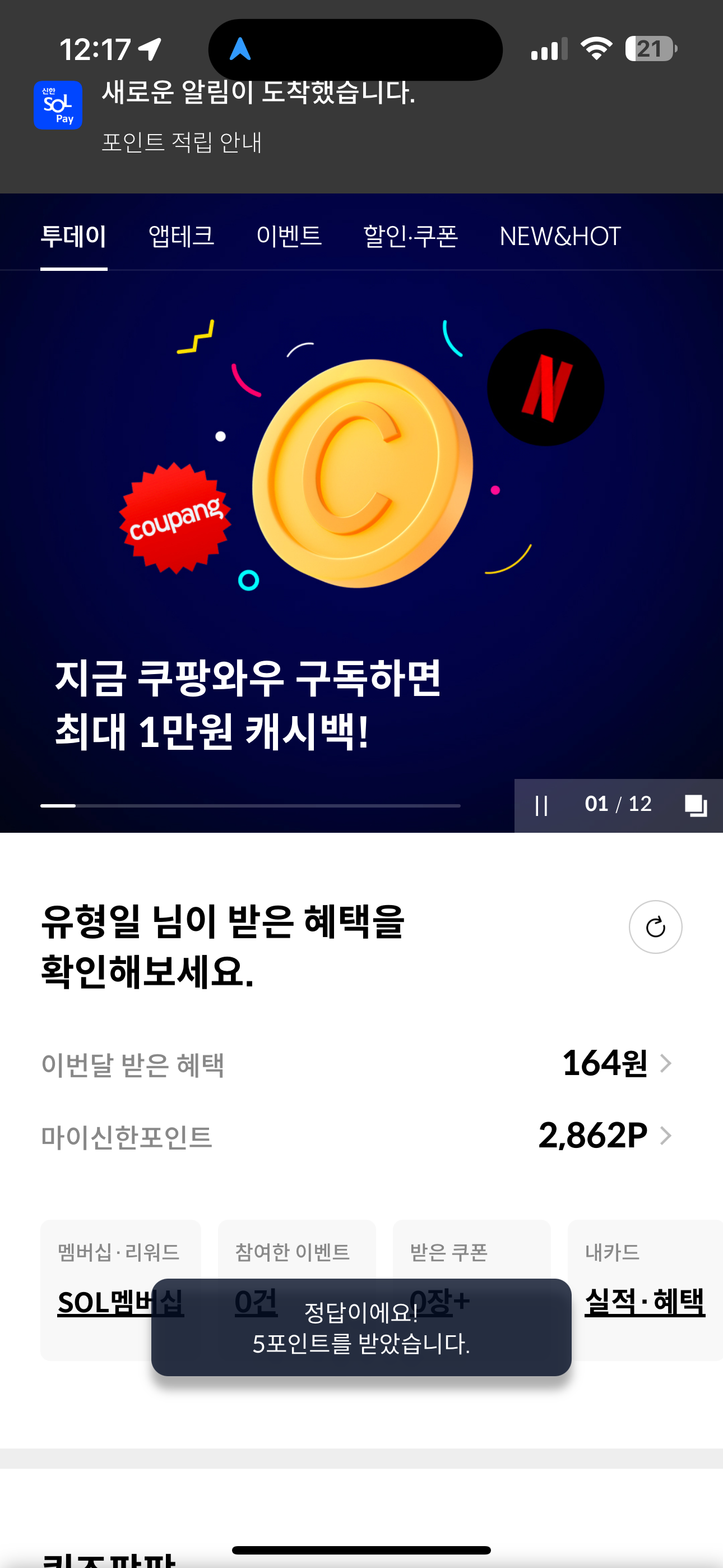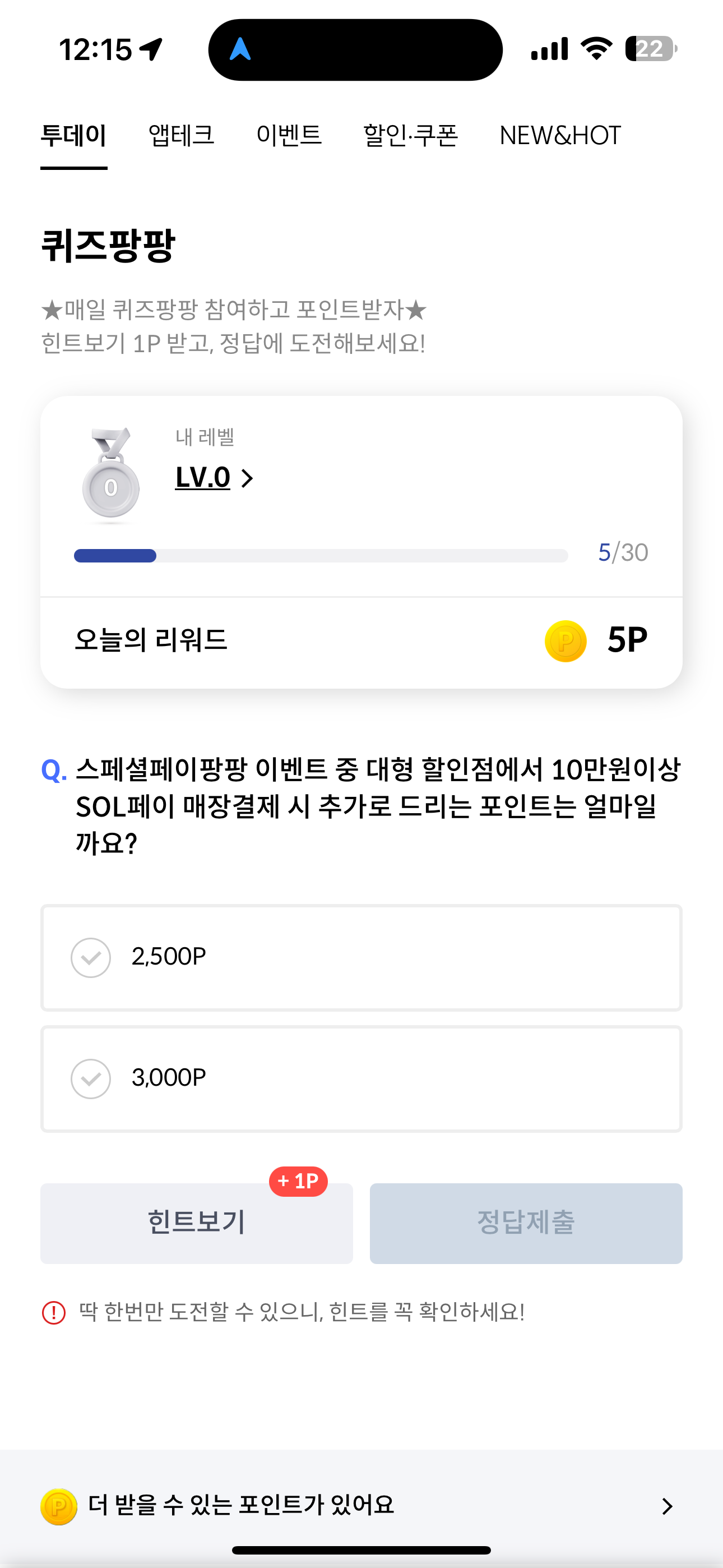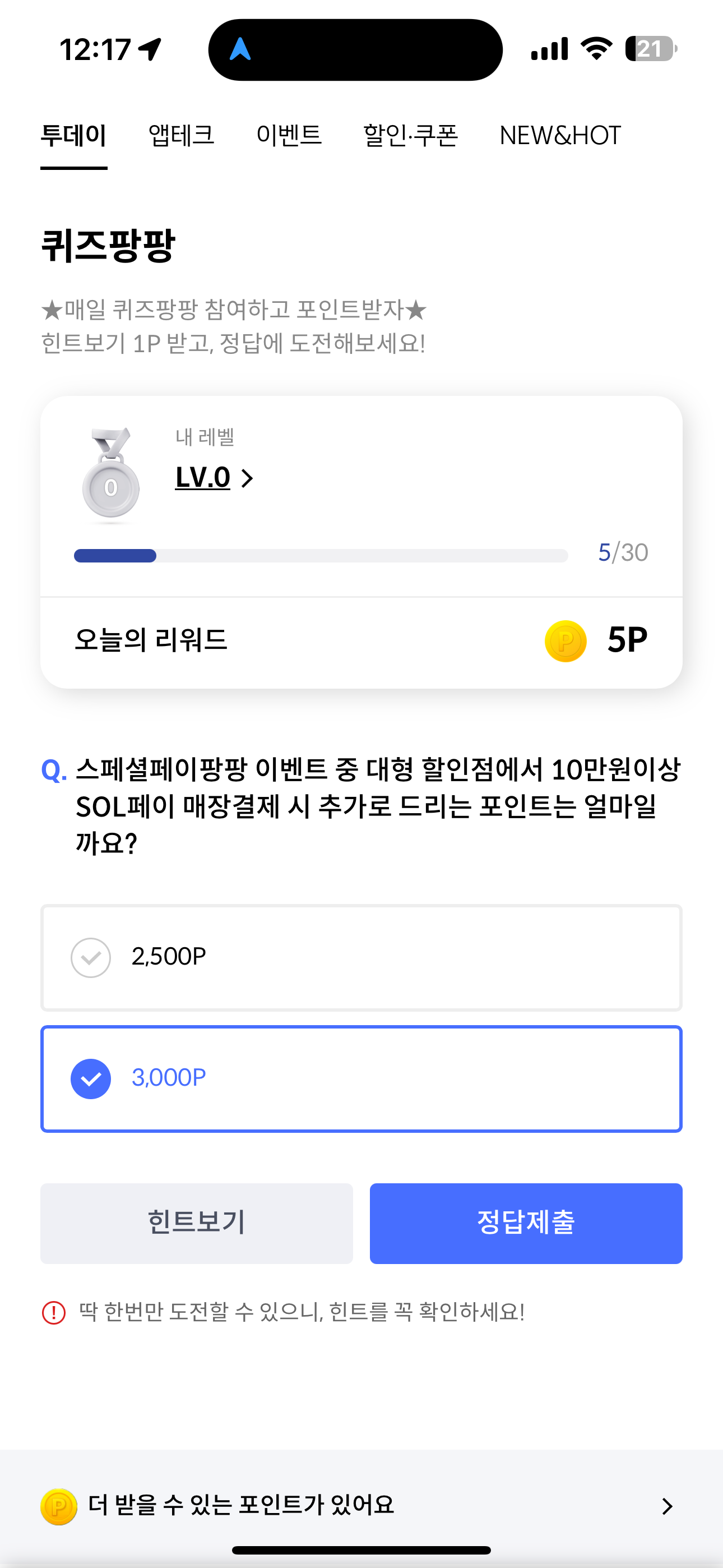 신한카드 퀴즈팡팡 정답은 3,000P 입니다