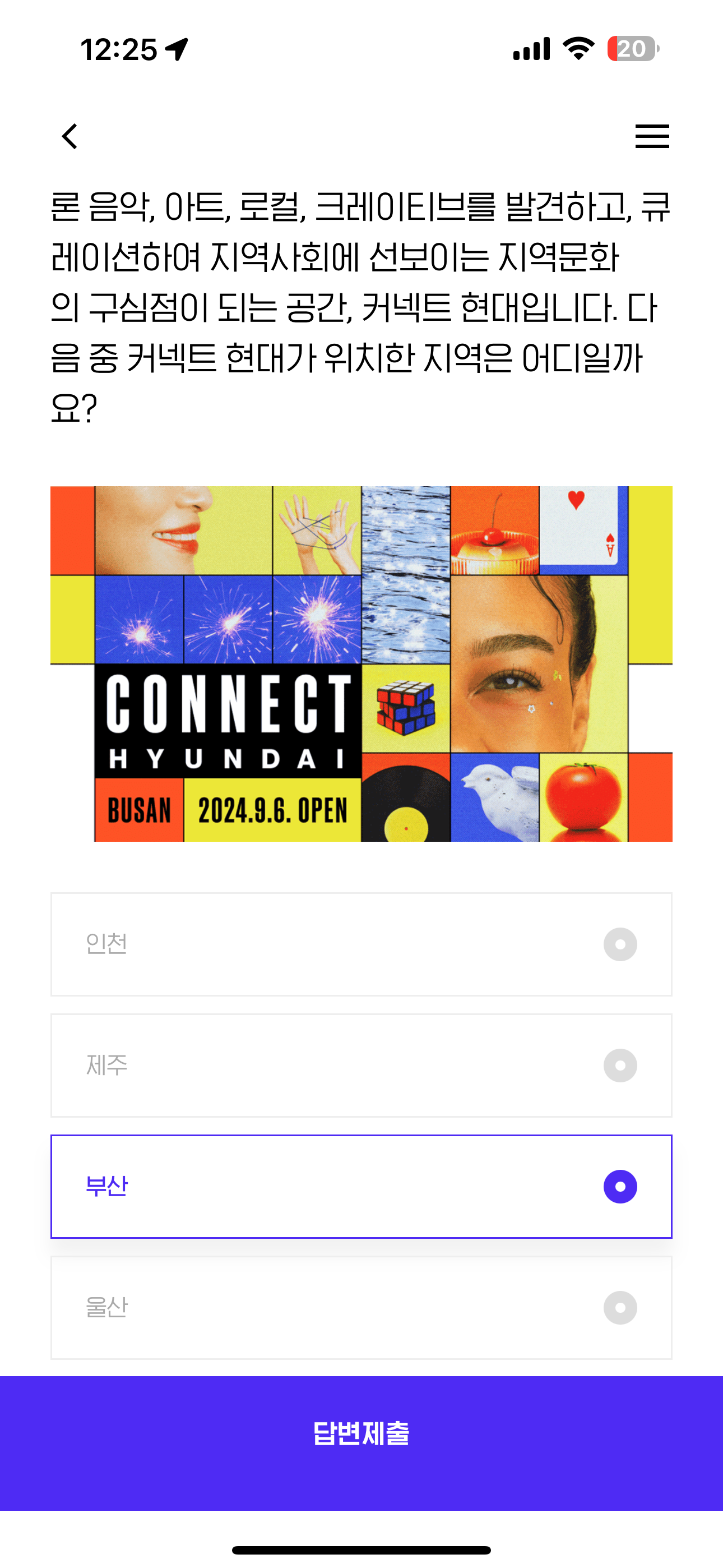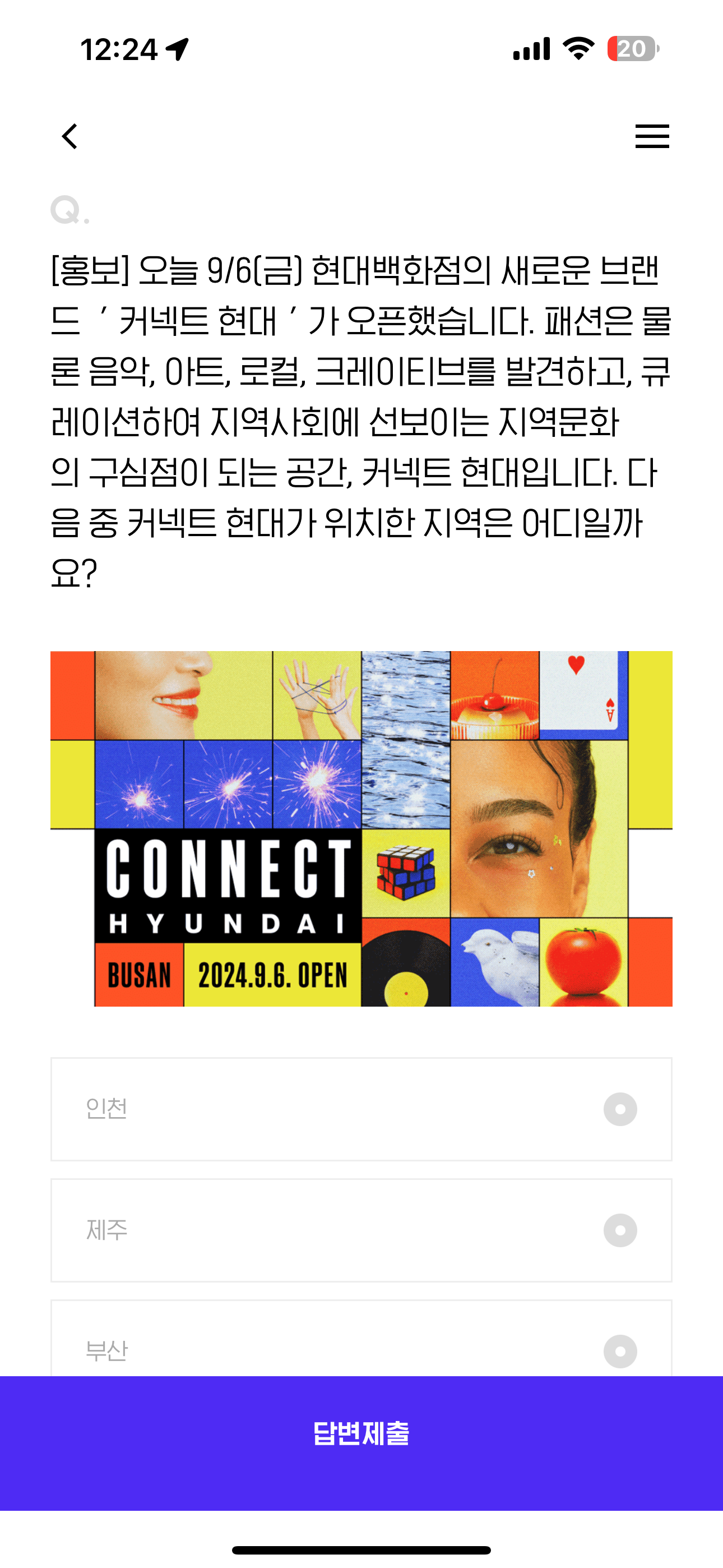 오늘 9/6(금) 현대백화점의 새로운 브랜드 ' 커넥트 현대 ' 가 오픈했습니다. 패션은 물론 음악, 아트, 로컬, 크레이티브를 발견하고, 큐레이션하여 지역사회에 선보이는 지역문화의 구심점이 되는 공간, 커넥트 현대입니다. 다음 중 커넥트 현대가 위치한 지역은 어디일까요? 보기는 1. 인천 2. 제주 3. 부산 4. 울산 입니다