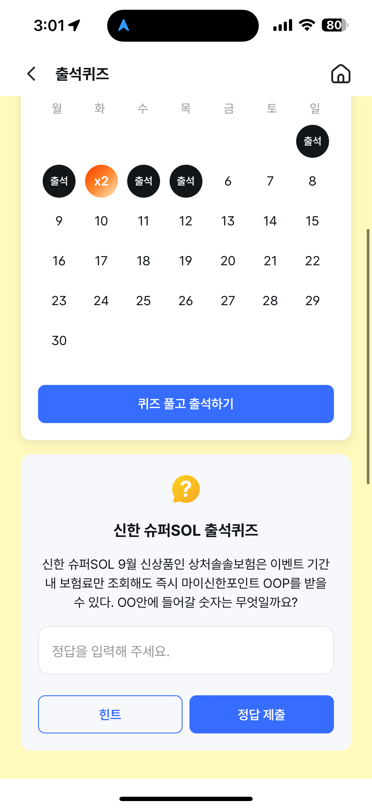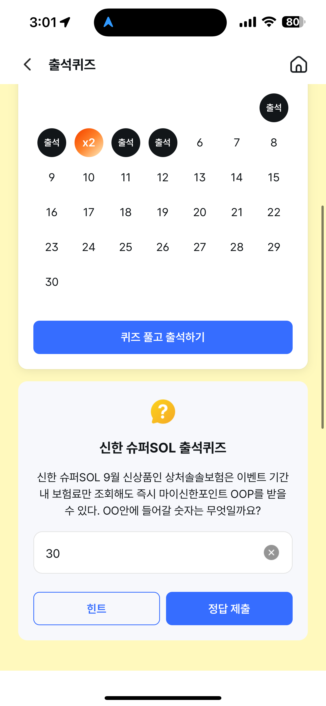 신한 슈퍼SOL 출석퀴즈 정답은 30 입니다