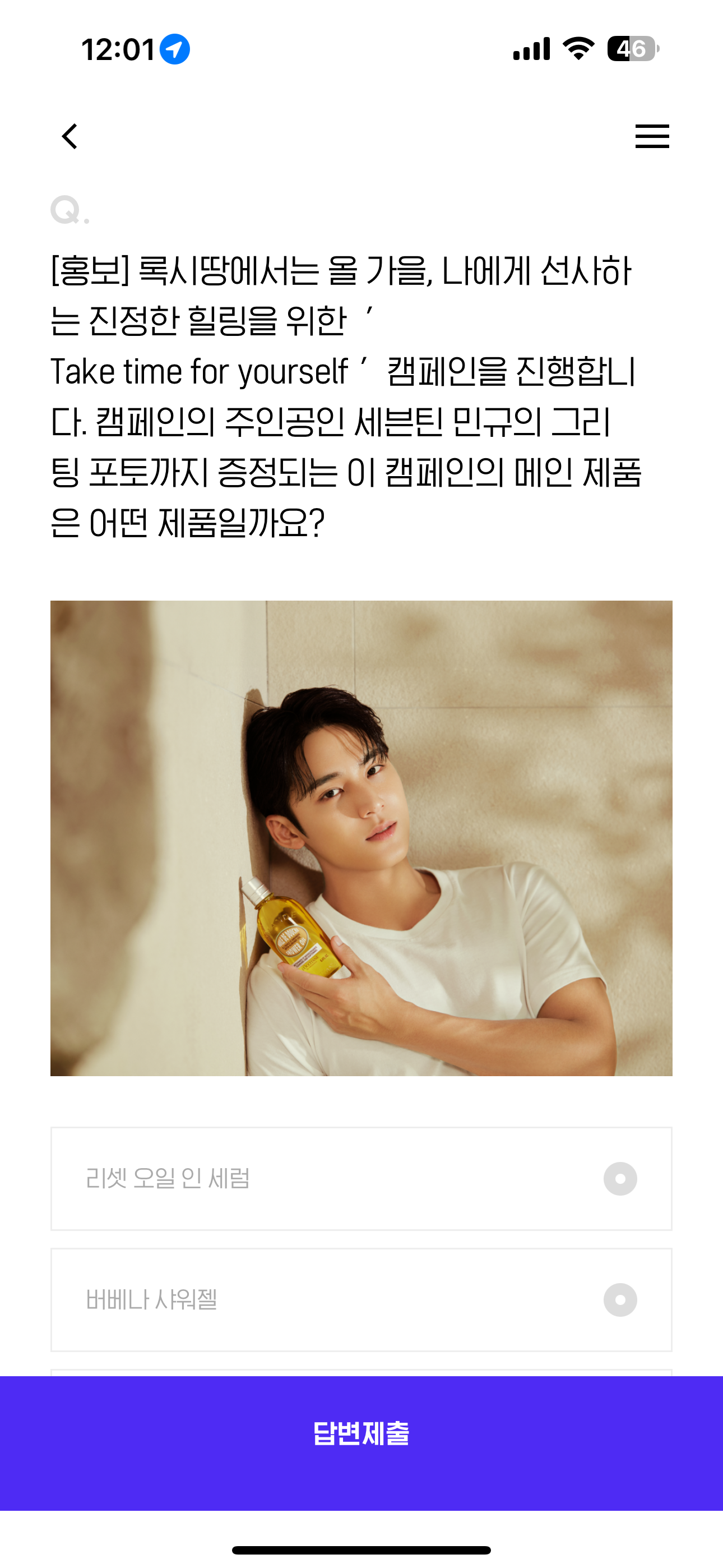 록시땅에서는 올 가을, 나에게 선사하는 진정한 힐링을 위한 ' Take time for yourself ' 캠페인을 진행합니다. 캠페인의 주인공인 세븐틴 민규의 그리팅 포토까지 증정되는 이 캠페인의 메인 제품은 어떤 제품일까요? 보기는 1. 리셋 오일 인 세럼 2. 버베나 샤워젤 3. 아몬드 샤워오일 4. 체리 블라썸 핸드 듀오 입니다.