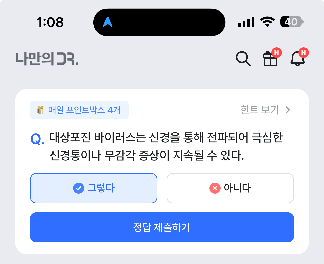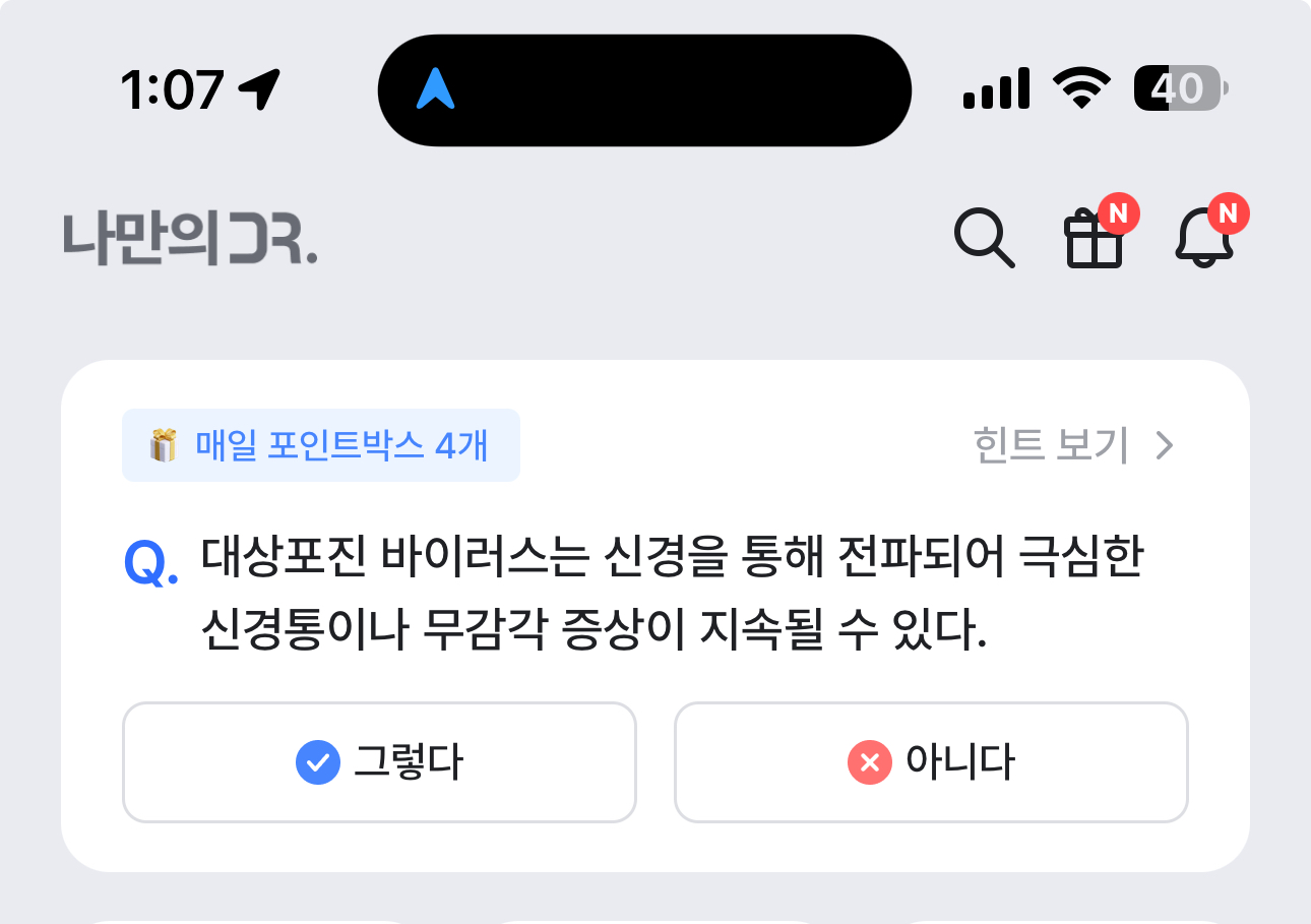 대상포진 바이러스는 신경을 통해 전파되어 극심한 신경통이나 무감각 증상이 지속될 수 있다. 그렇다 아니다 선택하면 되는데요. 대상포진 바이러스는 흔하게 걸리는 병중 하나죠. 스트레스를 받을때 생기기도 하는데요. 참고해 두세요
