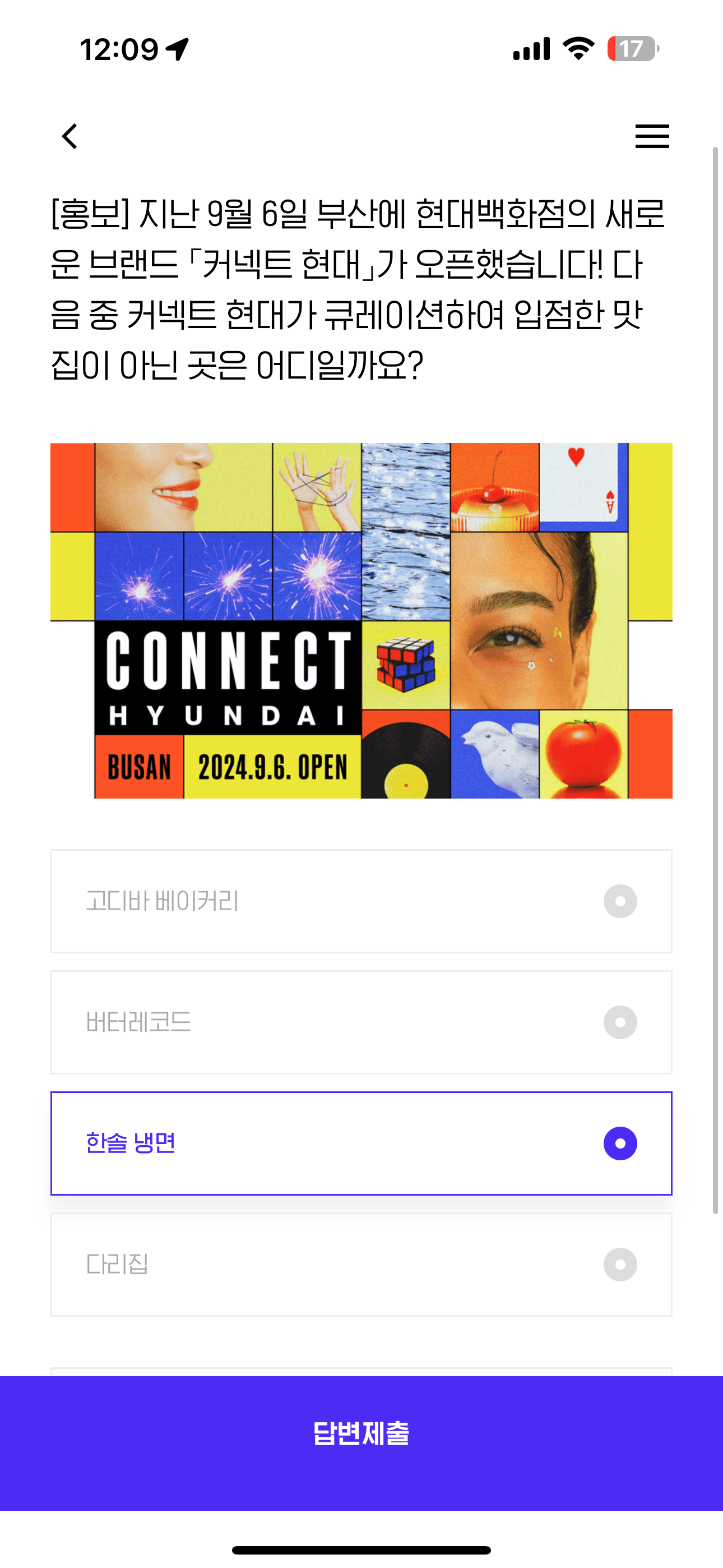 H포인트 퀴즈 9월 10일 정답(지난 9월 6일 부산에 현대백화점의 새로운 브랜드 커넥트 현대가 오픈했습니다! 다음 중 커넥트 현대가 큐레이션하여 입점한 맛집이 아닌 곳은 어디일까요?)