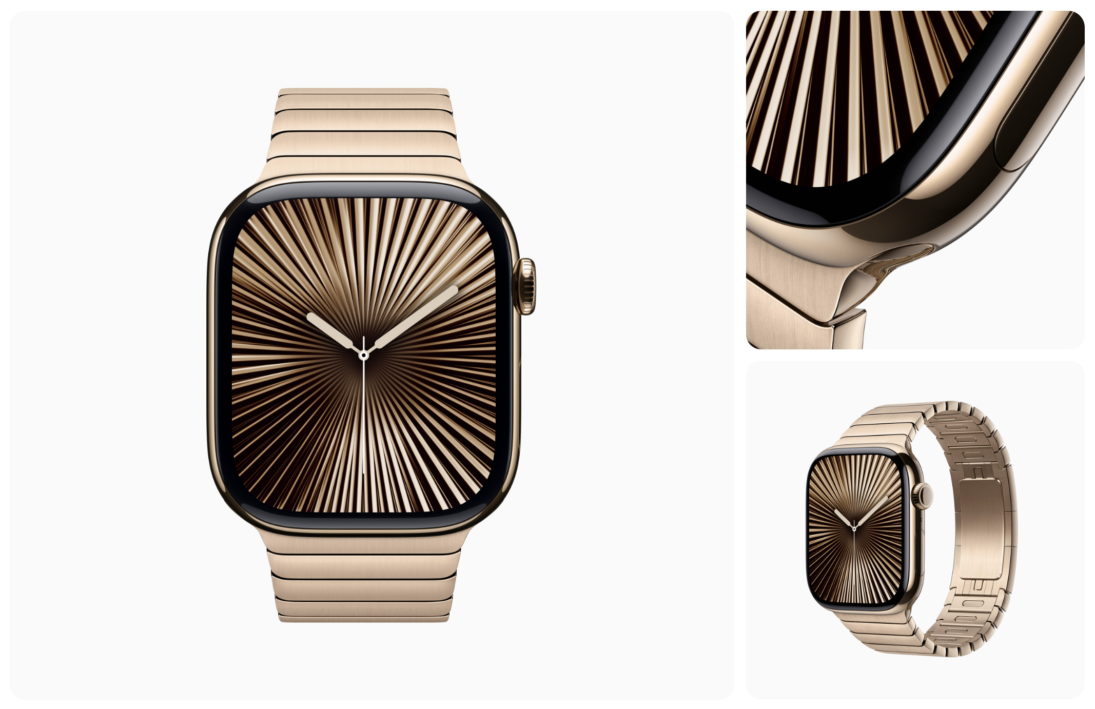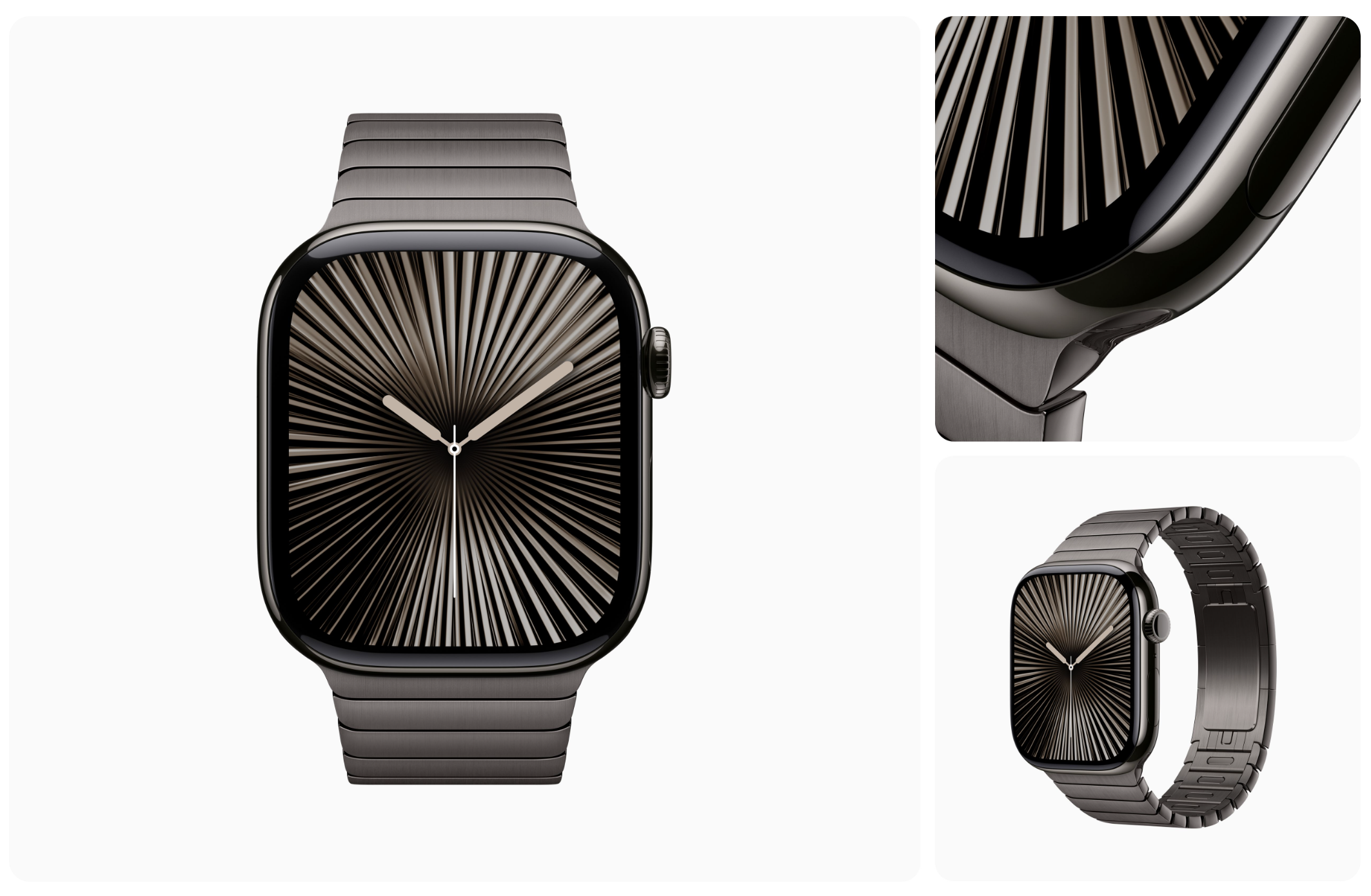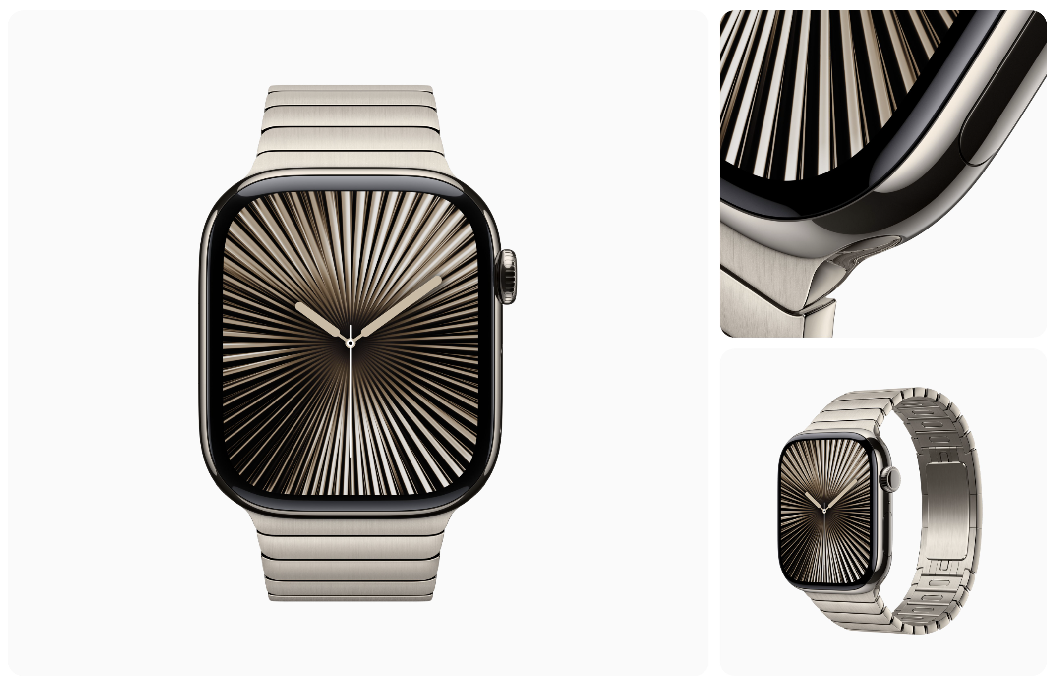 그리고 애플워치10 티타늄 모델은 잔상 시계 페이스를 새롭게 선보였습니다. 촘촘하게 반짝이며 사용자의 움직임에 맞춰 섬세하게 반응하는 다이얼을 표시하고 새로운 티타늄 케이스의 광택 질감에 잘 어울리도록 설계되어 있습니다.