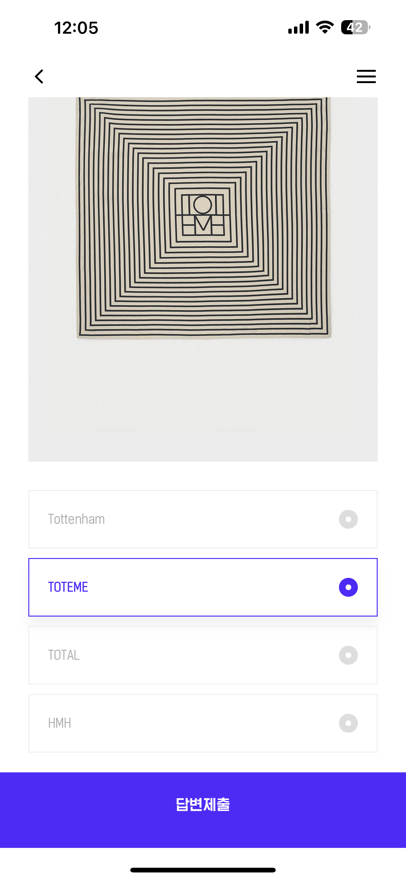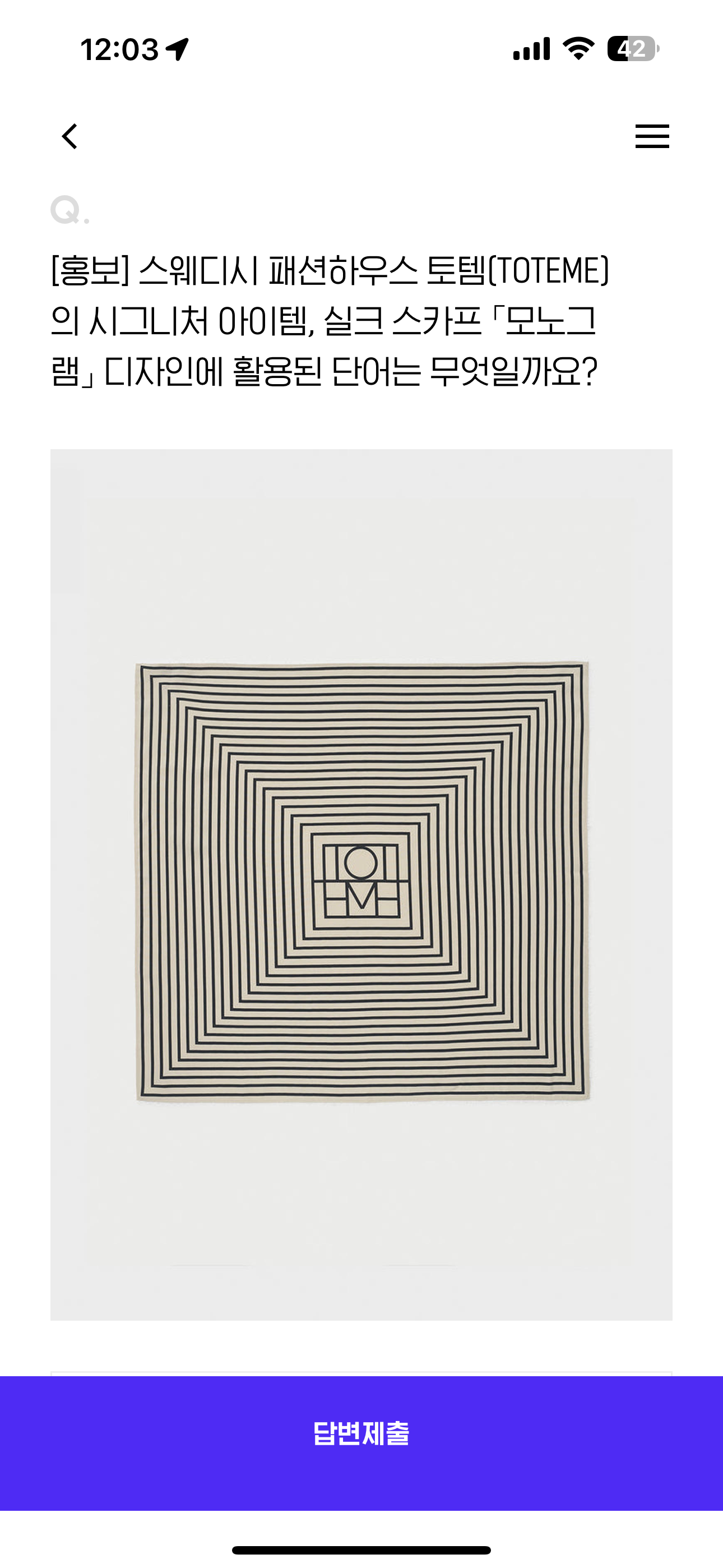 스웨디시 패션하우스 토템[TOTEME]의 시그니처 아이템, 실크 스카프 모노그램 디자인에 활용된 단어는 무엇일까요? 보기는 1. Tottenham 2. TOTEME 3. TOTAL 4. HMH 입니다. 이번 문제는 너무나 쉽죠 그림 속에 답이 있습니다.