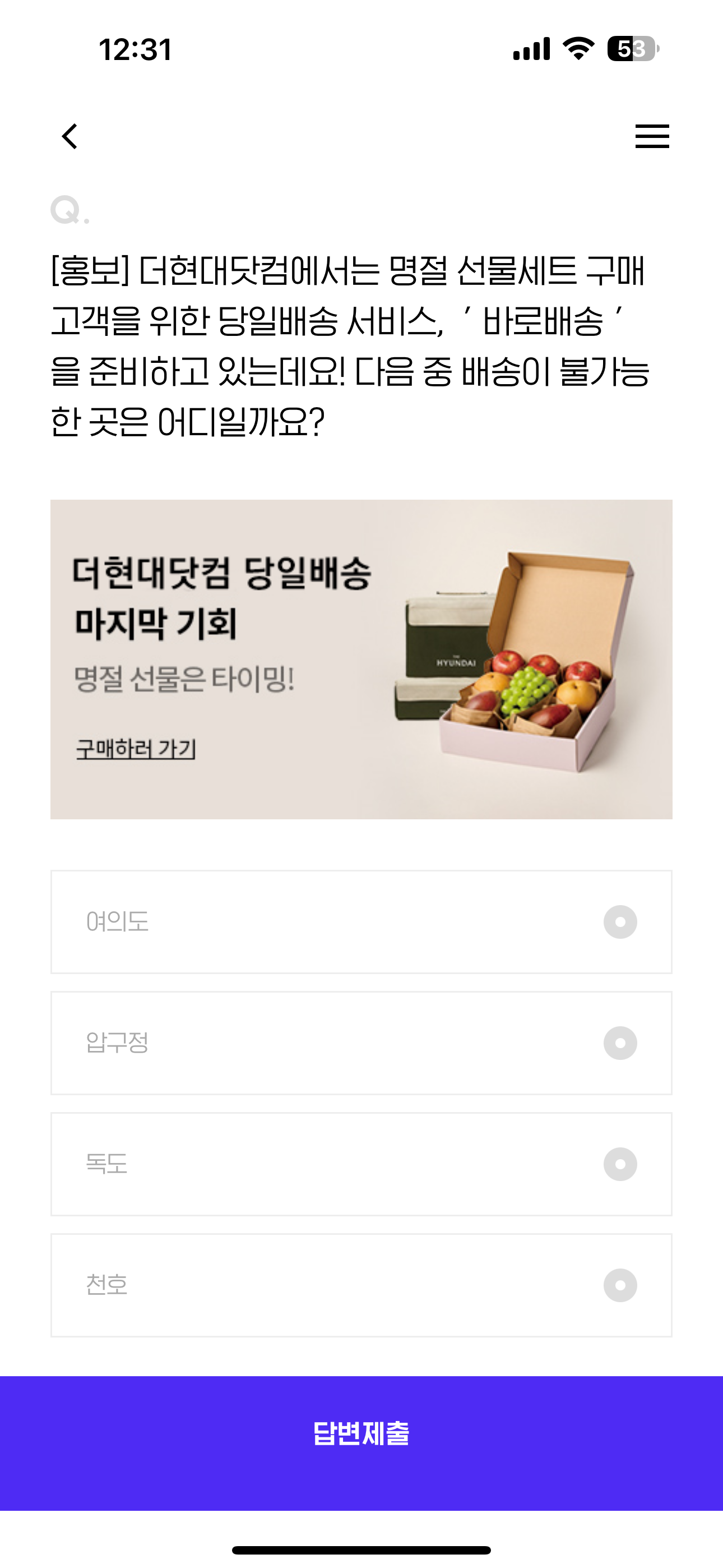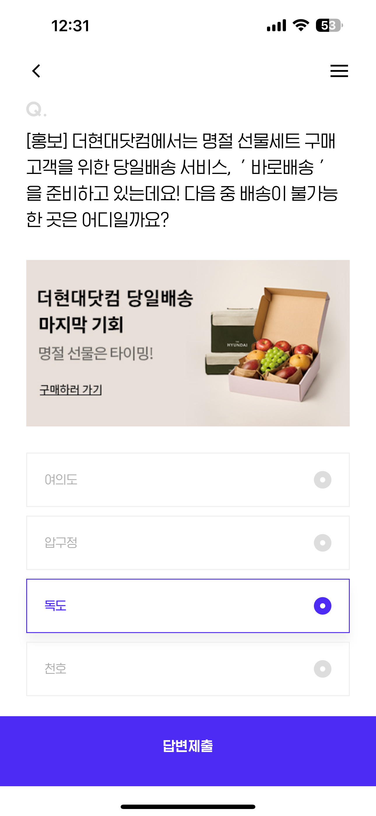 더현대닷컴에서는 명절 선물세트 구매 고객을 위한 당일배송 서비스, ' 바로배송 ' 을 준비하고 있는데요! 다음 중 배송이 불가능 한 곳은 어디일까요? 보기는 1. 여의도 2. 압구정 3. 독도 4. 천호 입니다. 명절 선물세트 구매 고객은 당일배송 서비스를 한다고 합니다 참고해 두세요