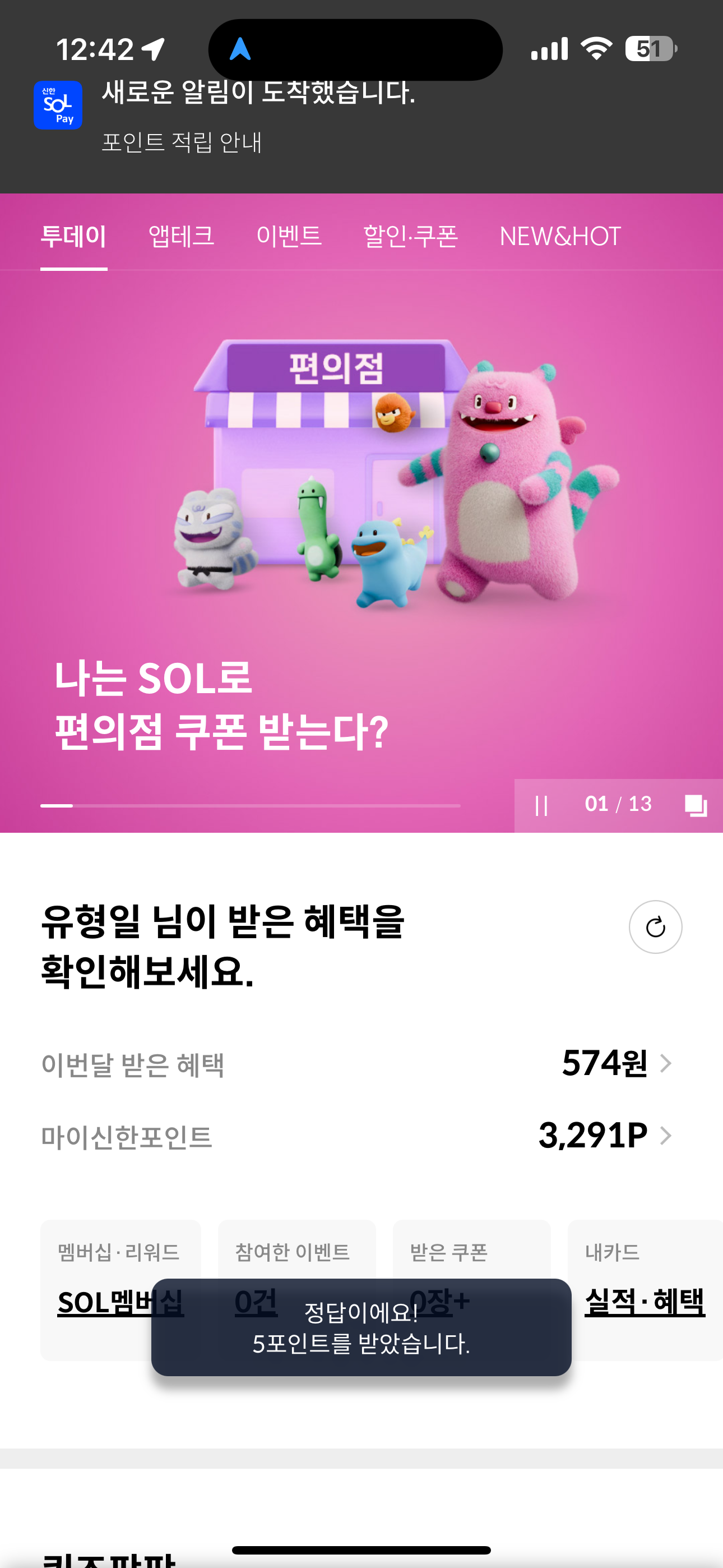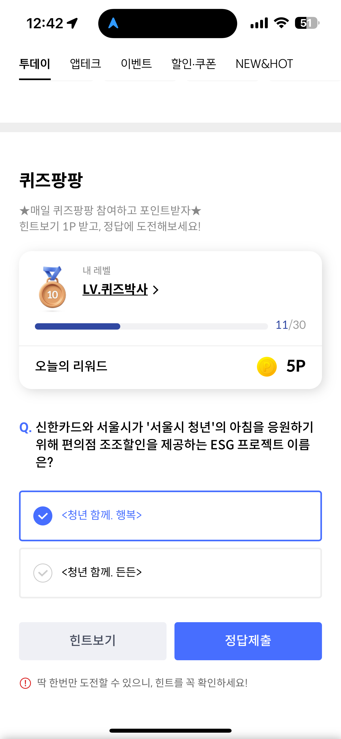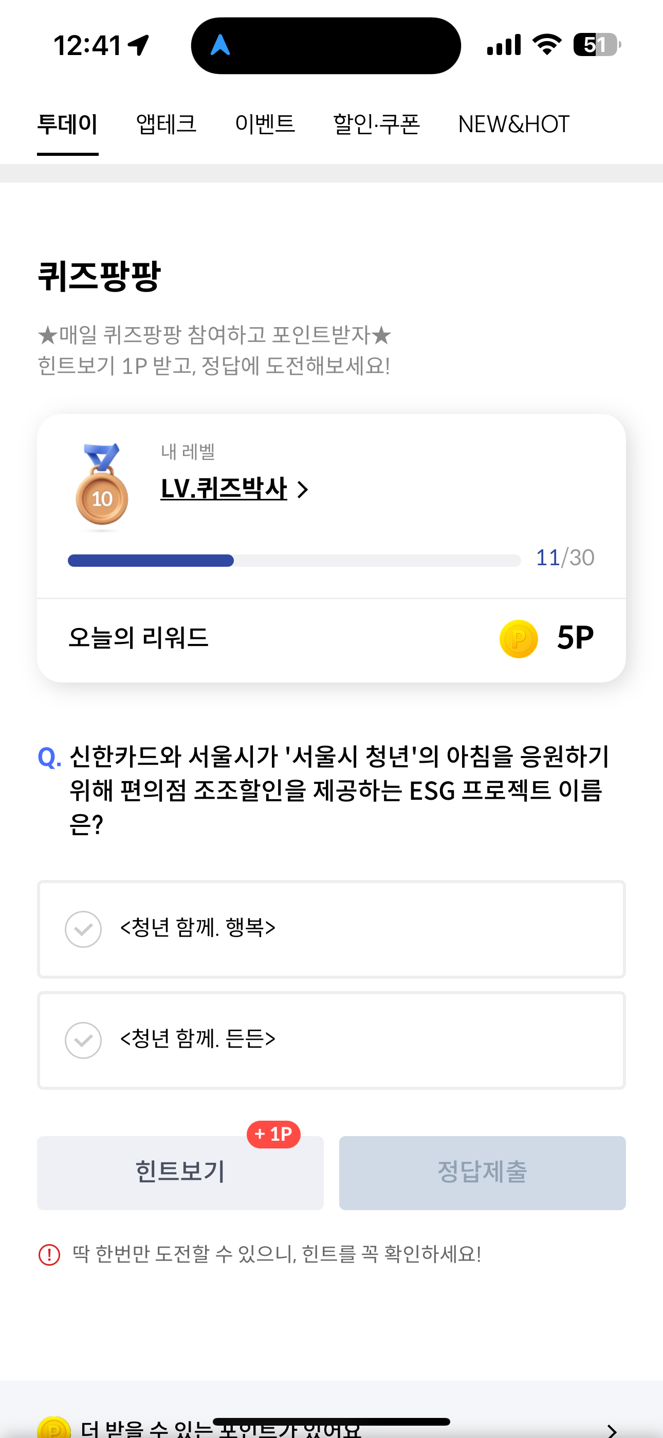 신한카드 퀴즈팡팡 9월 12일 정답(신한카드와 서울시가 '서울시 청년'의 아침을 응원하기 위해 편의점 조조할인을 제공하는 ESG 프로젝트 이름은?)