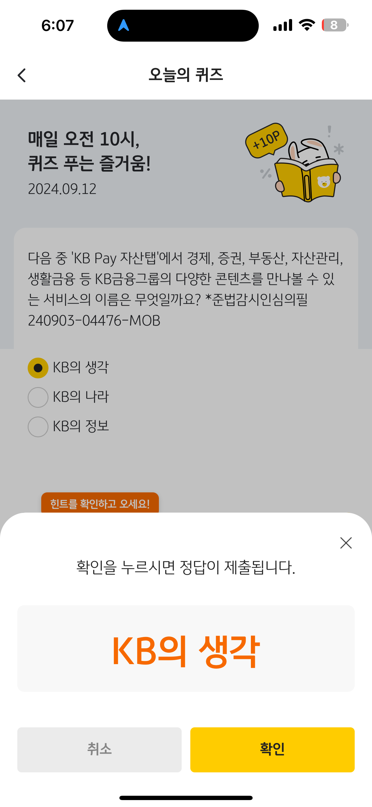 KB Pay 오늘의 퀴즈 정답은 KB의 생각 입니다