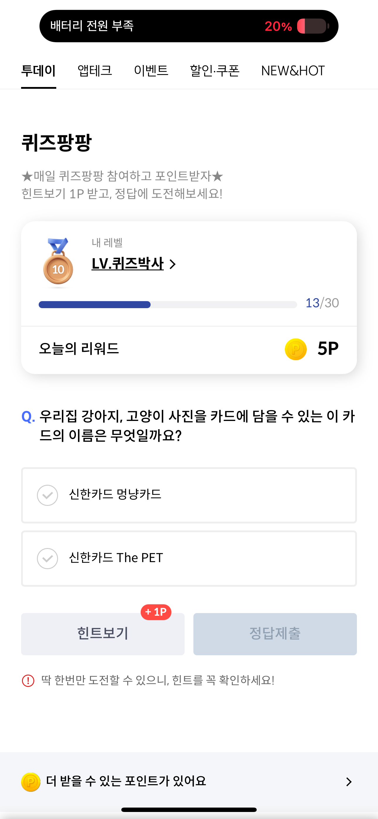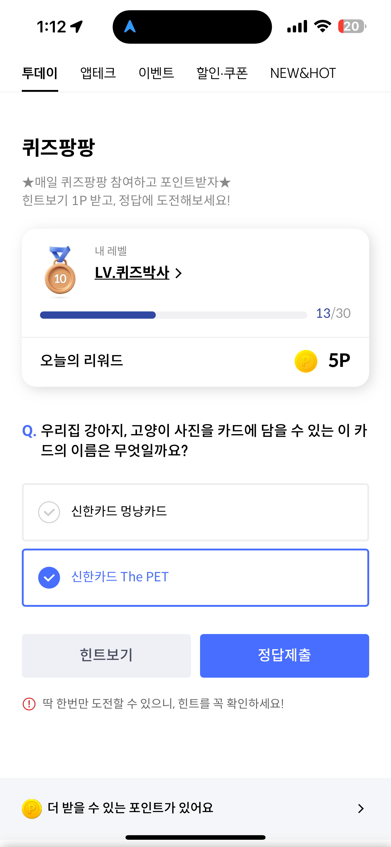신한카드 퀴즈팡팡 정답은 신한카드 The PET 입니다