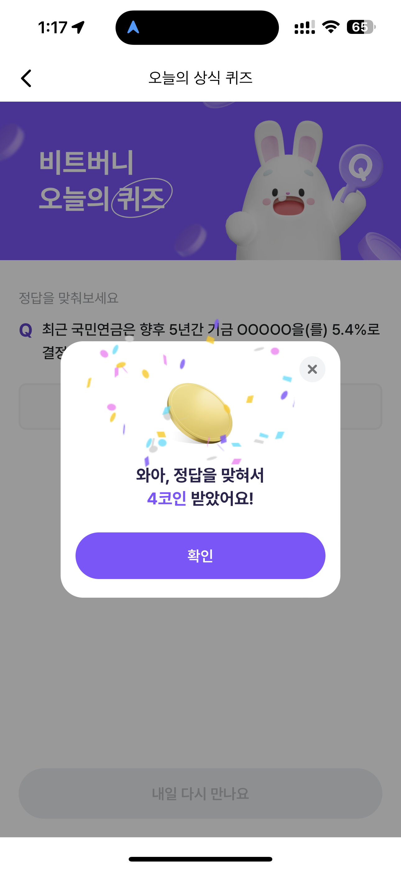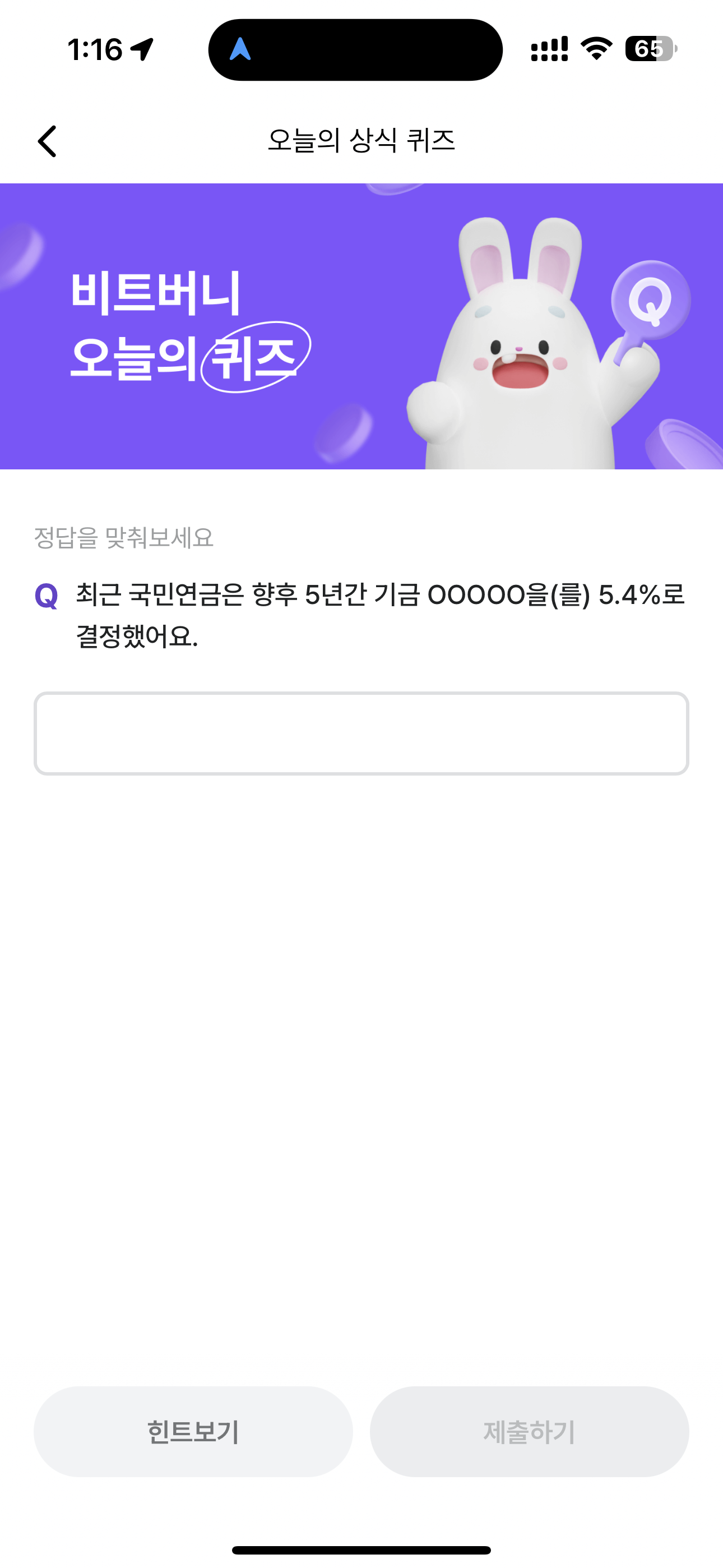 비트버니 오늘의 퀴즈 6월 4일 ㅁㅍㅅㅇㄹ정답(최근 국민연금은 향후 5년간 기금 OOOOO을(를) 5.4%로 결정했어요.)