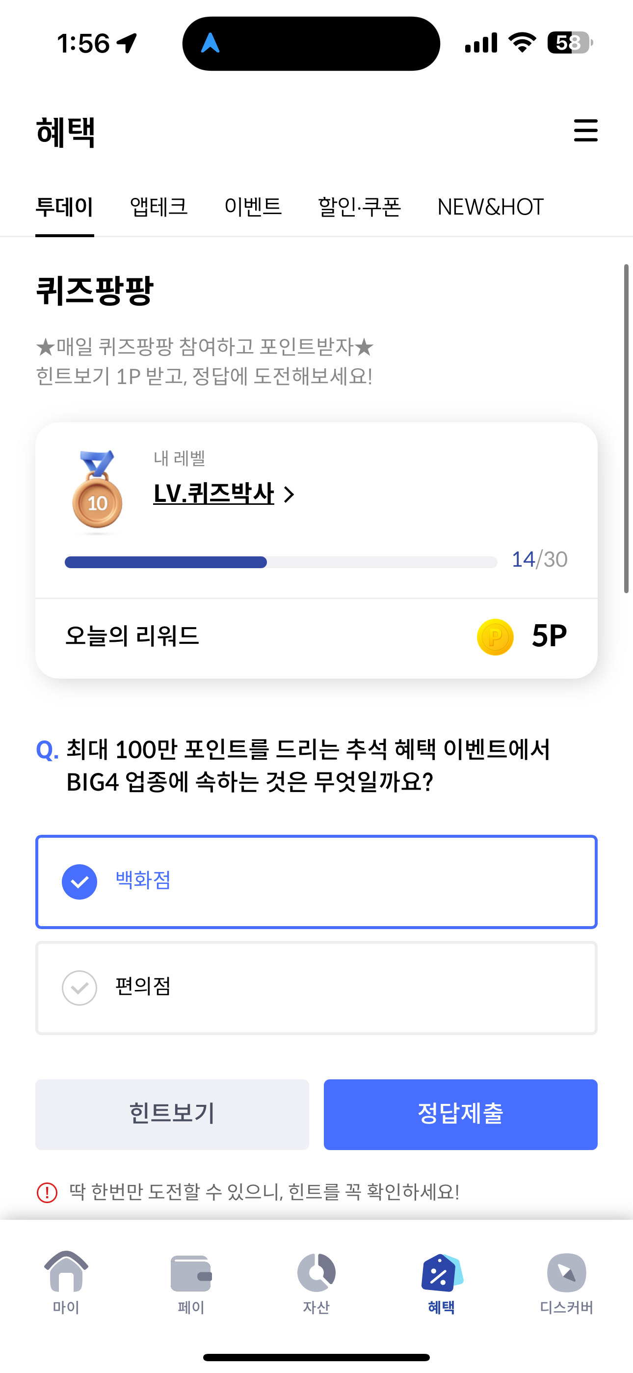 신한카드 퀴즈팡팡 정답은 백화점 입니다