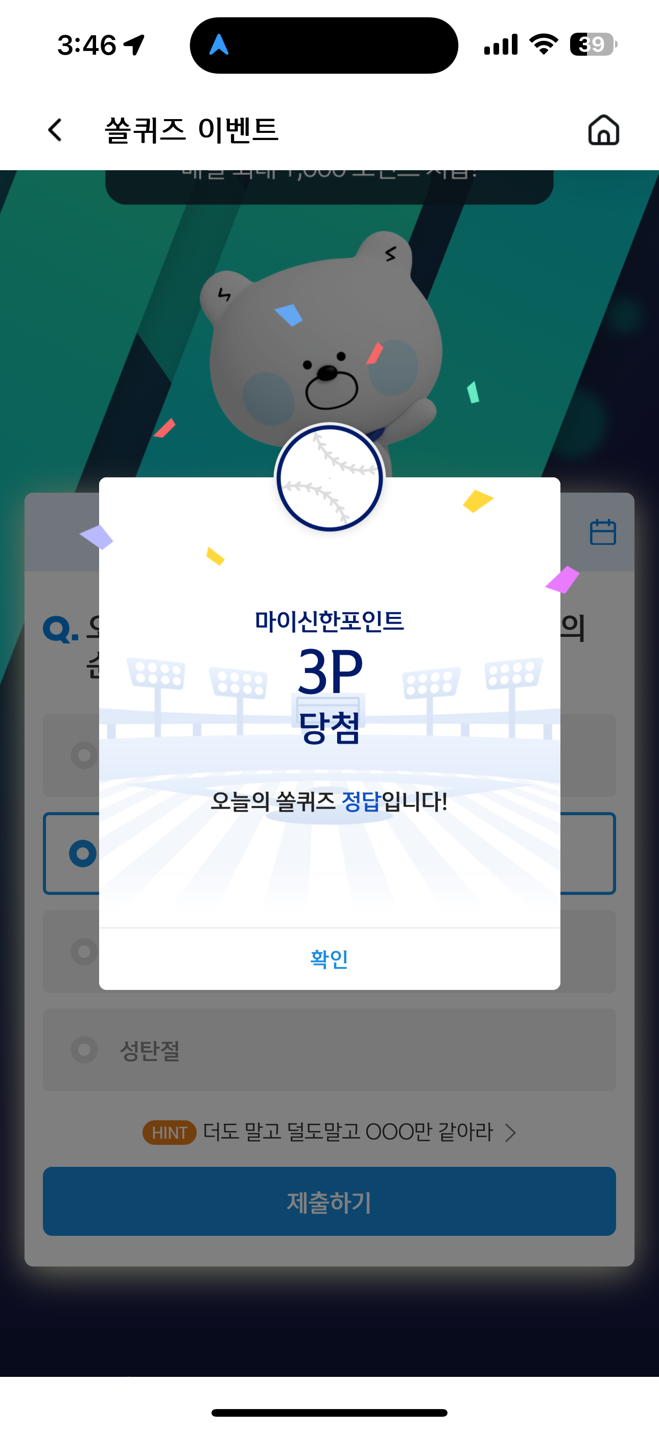 신한 슈퍼SOL 야구/상식 쏠퀴즈 정답은 한가위 입니다
