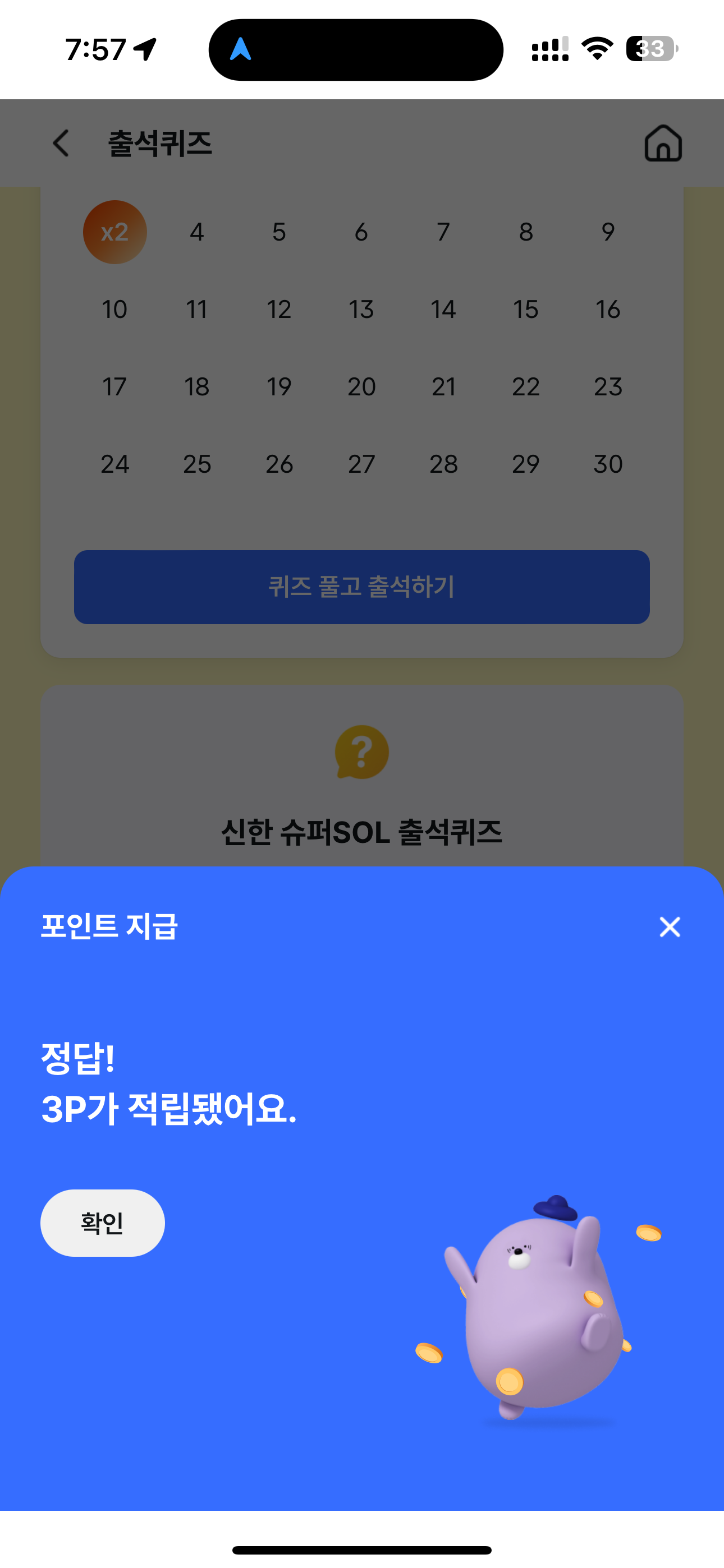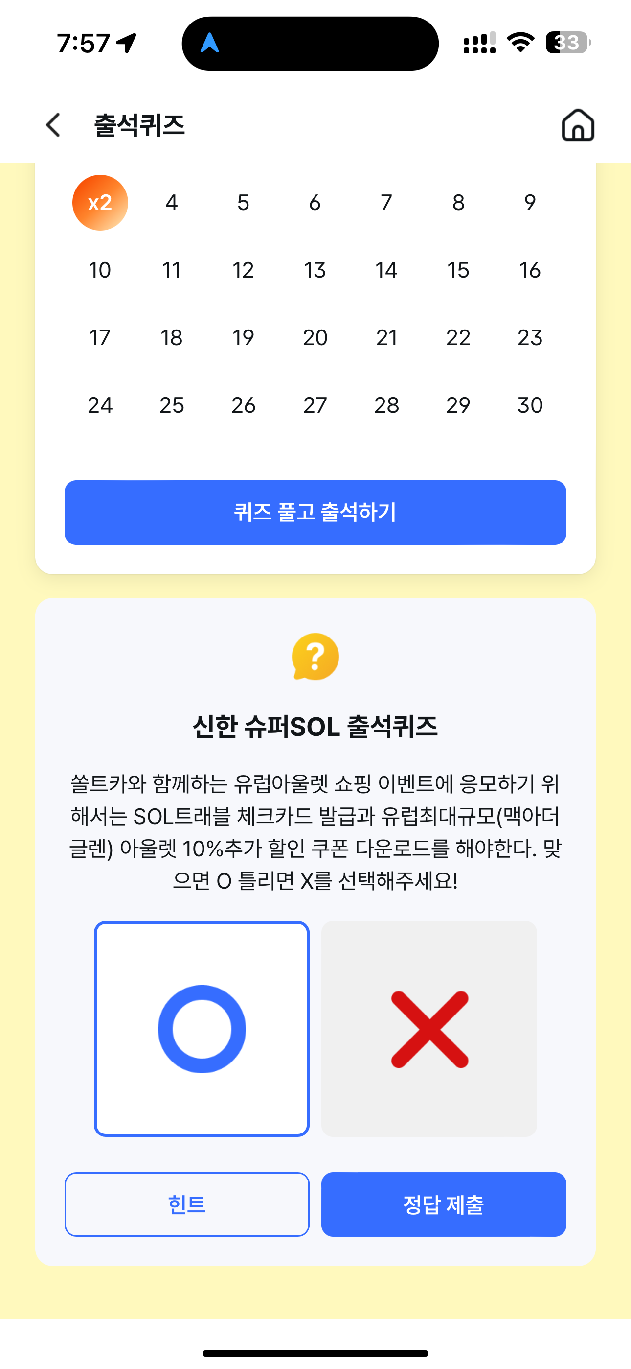 신한 슈퍼SOL 출석퀴즈 정답은 O 입니다