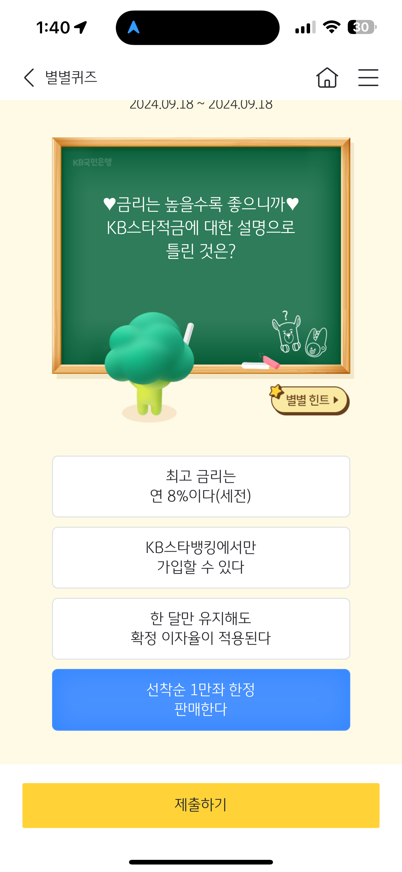 KB스타뱅킹 별별퀴즈 9월 18일 정답(금리는 높을수록 좋으니까 KB스타적금에 대한 설명으로 틀린 것은?)