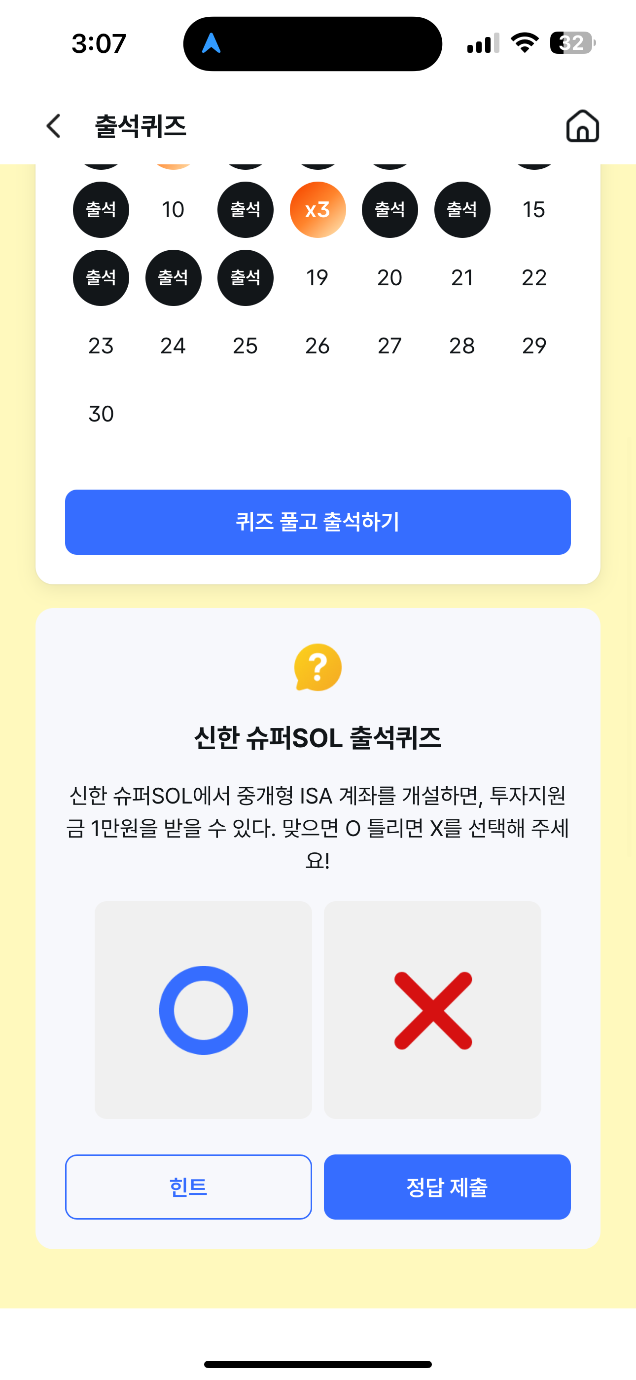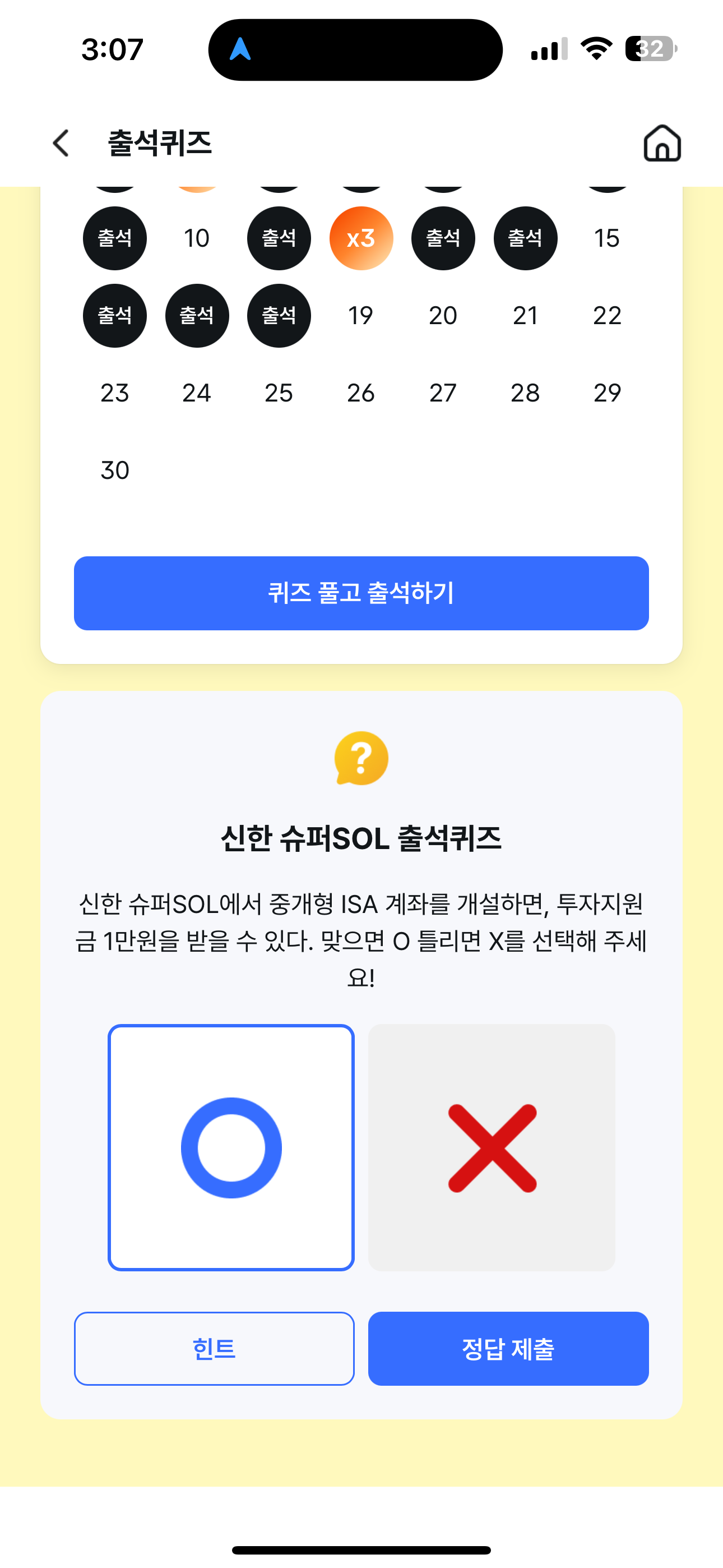 신한 슈퍼SOL 출석퀴즈 정답은 O 입니다