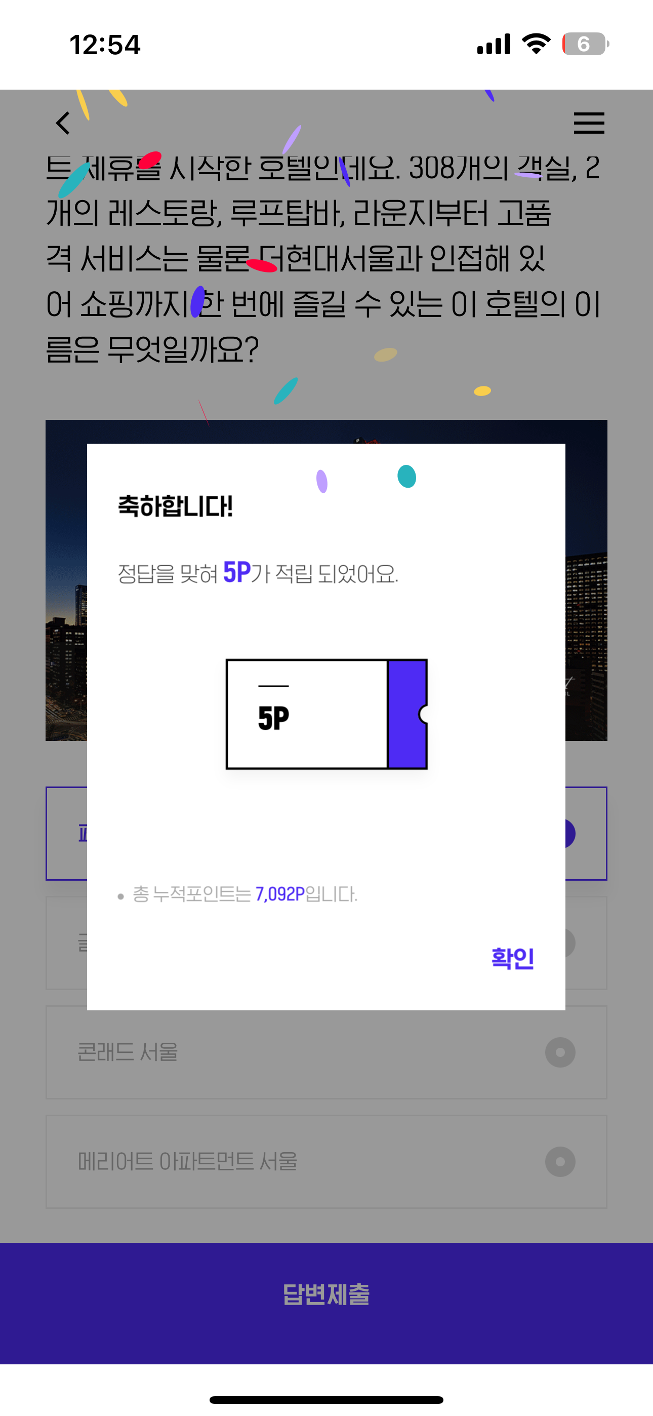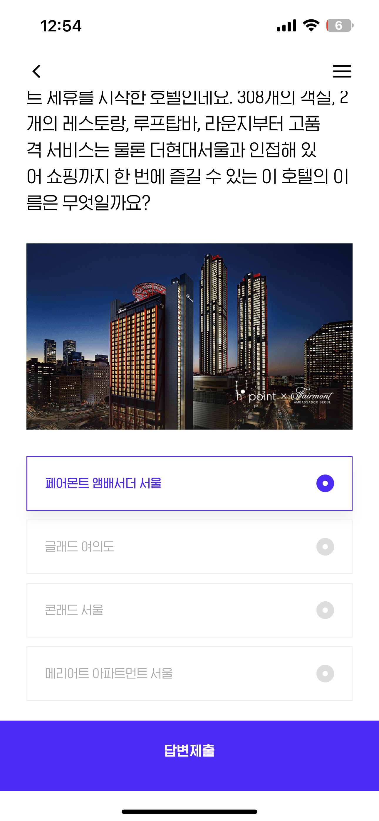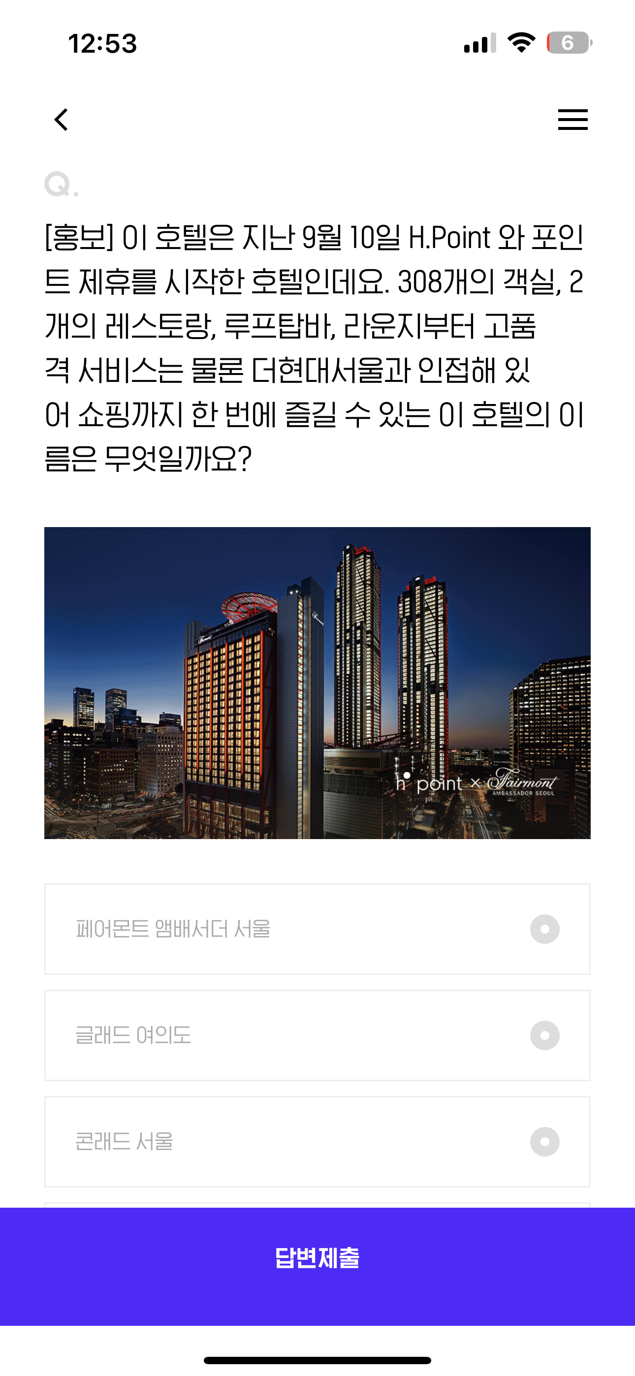 이 호텔은 지난 9월 10일 H.Point 와 포인트 제휴를 시작한 호텔인데요. 308개의 객실, 2개의 레스토랑, 루프탑바, 라운지부터 고품격 서비스는 물론 더현대서울과 인접해 있어 쇼핑까지 한 번에 즐길 수 있는 이 호텔의 이름은 무엇일까요? 보기는 1. 페어몬트 앰버서더 서울 2. 글래드 여의도 3. 콘래드 서울 4. 메리어트 아파트먼트 서울 입니다