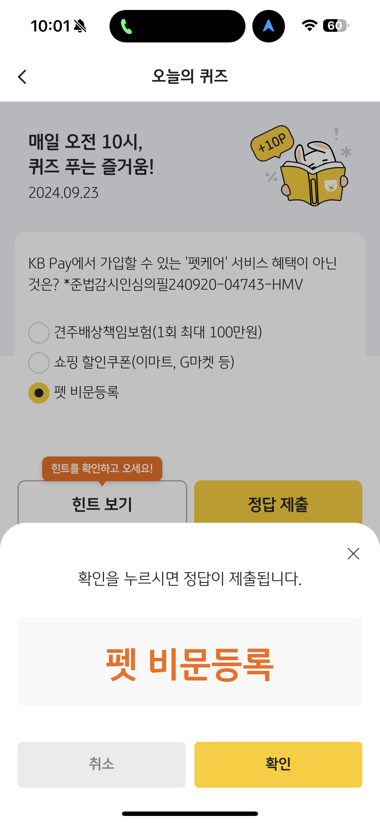 KB Pay 오늘의 퀴즈 정답은 펫 비문등록 입니다