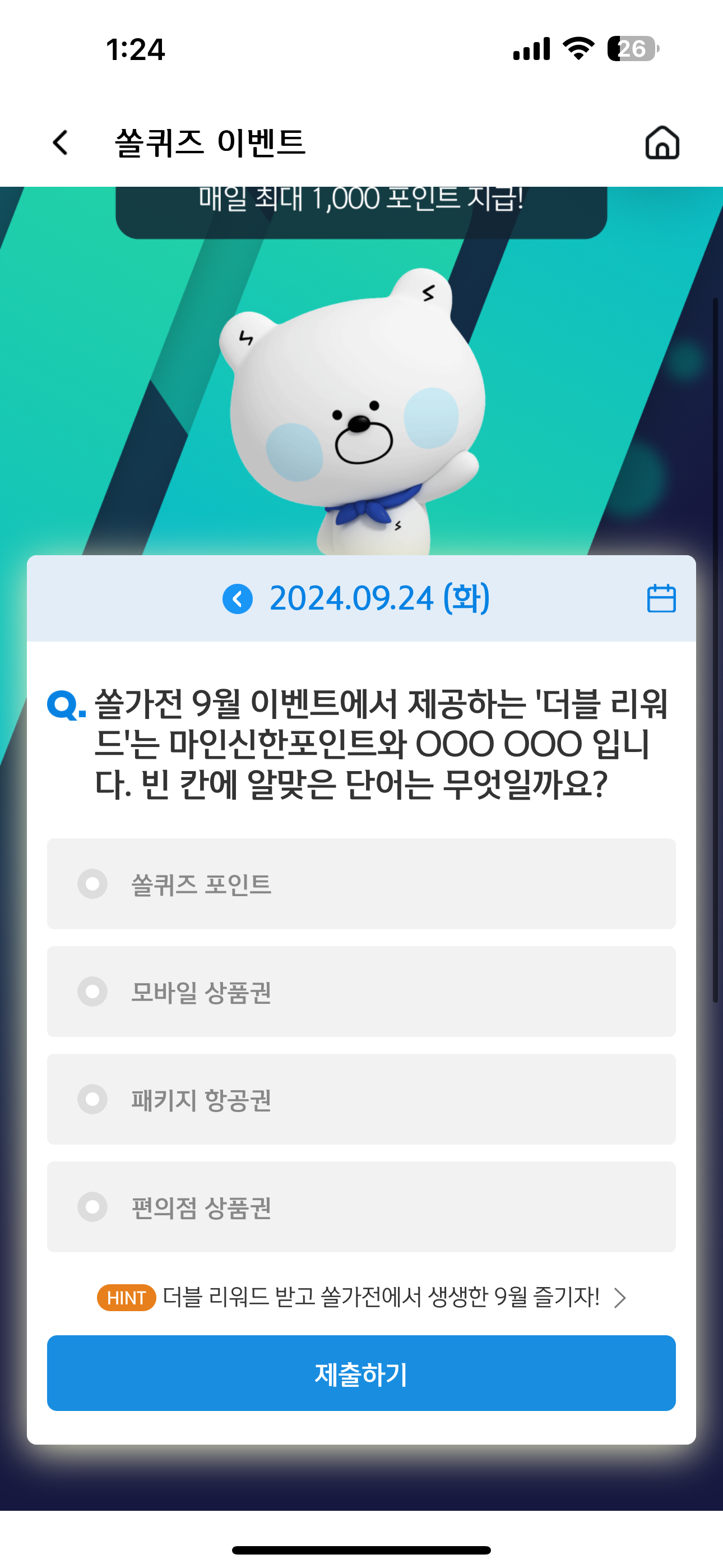 쏠가전 9월 이벤트에서 제공하는 '더블 리워드'는 마이신한포인트와 OOO OOO 입니다. 빈 칸에 알맞은 단어는 무엇일까요? 보기는 1. 쏠퀴즈 포인트 2. 모바일 상품권 3. 패키지 항공권 4. 편의점 상품권 입니다. 더블 리워드로 마이신한포인트와 함께 혜택을 받을 수 있으니 놓치지 말고 활용해 보세요
