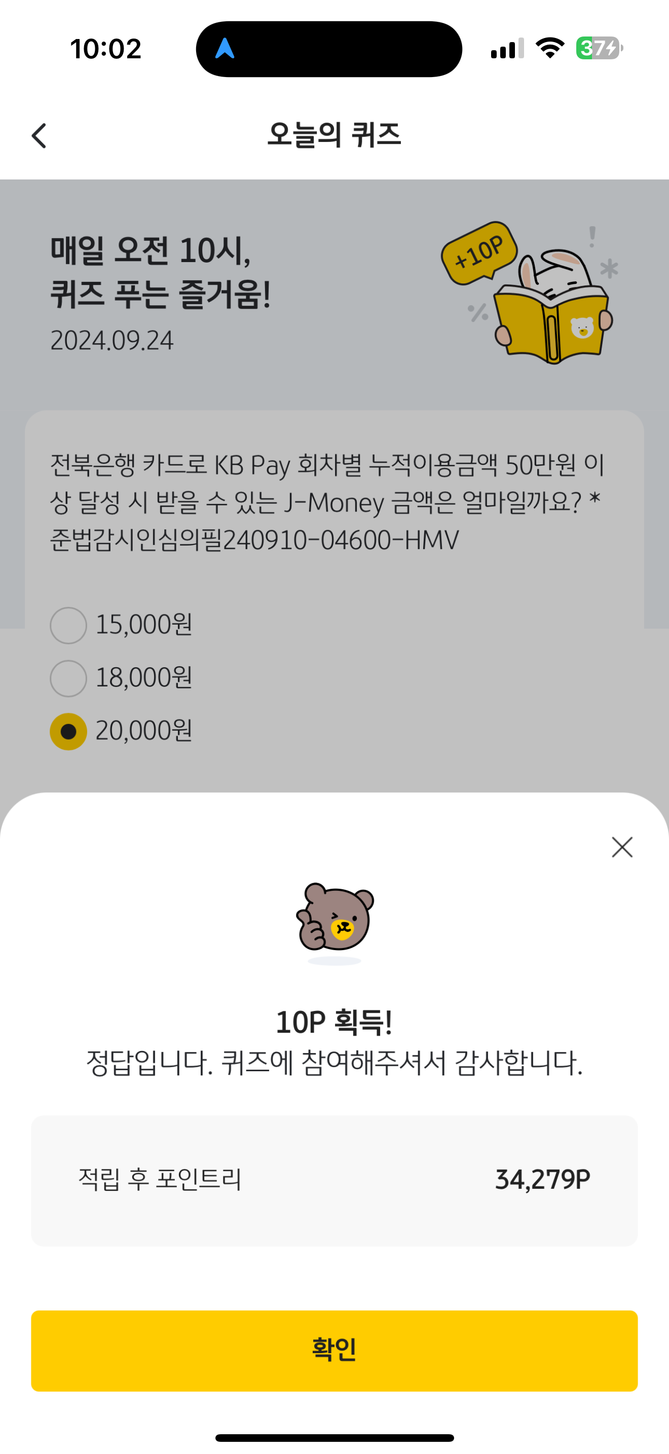KB Pay 오늘의 퀴즈 9월 24일 정답(전북은행 카드로 KB Pay 회차별 누적이용금액 50만원 이상 달성 시 받을 수 있는 J-Money 금액은 얼마일까요?)