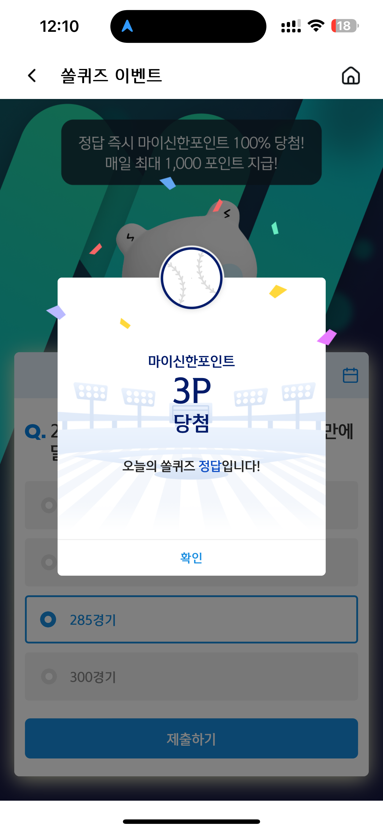 신한 슈퍼SOL 야구/상식 쏠퀴즈 정답은 285경기 입니다