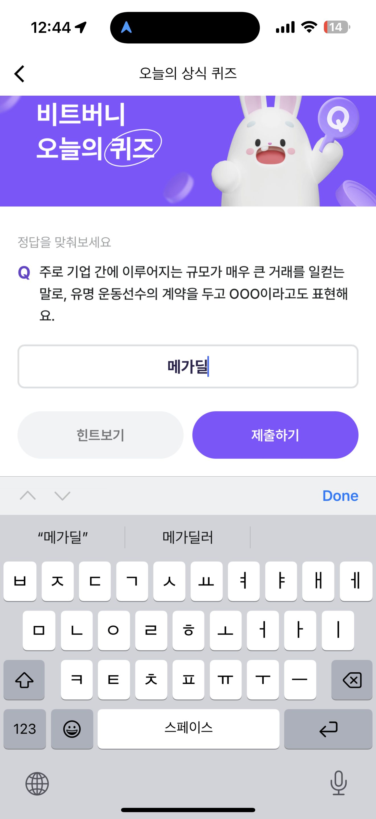 비트버니 오늘의 퀴즈 정답은 메가딜 입니다