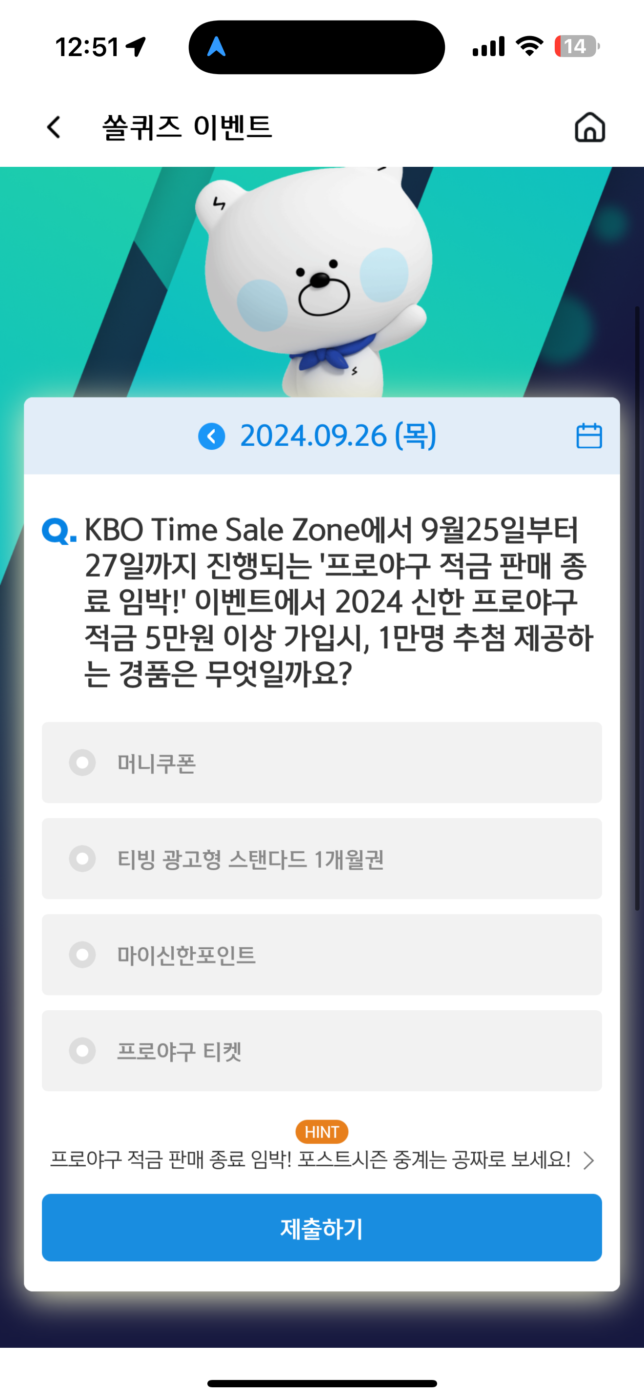 KBO Time Sale Zone에서 9월25일부터 27일까지 진행되는 '프로야구 적금 판매 종료 임박!' 이벤트에서 2024 신한 프로야구 적금 5만원 이상 가입시, 1만명 추첨 제공하는 경품은 무엇일까요? 보기는 1. 머니쿠폰 2. 티빙 광고형 스탠다드 1개월권 3. 마이신한포인트 4. 프로야구 티켓 입니다.