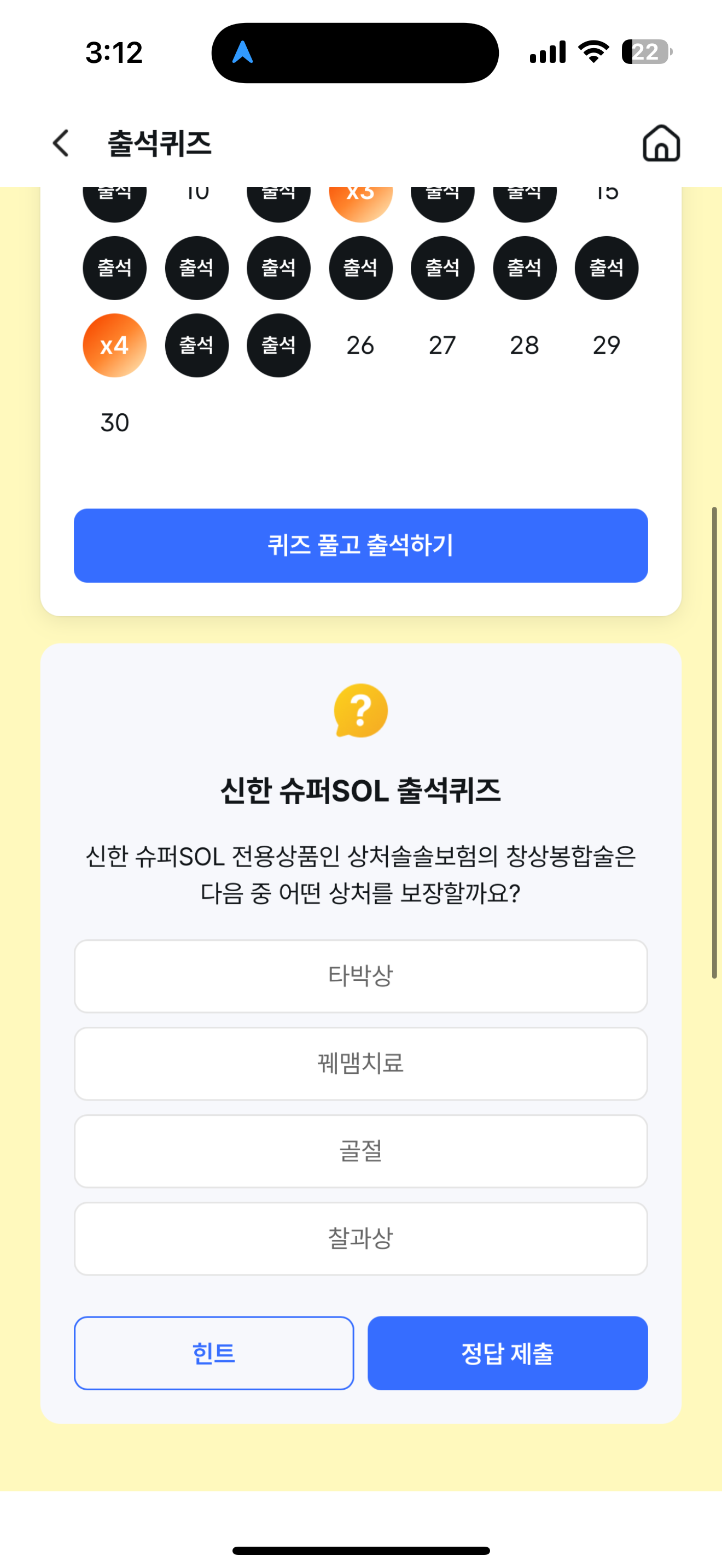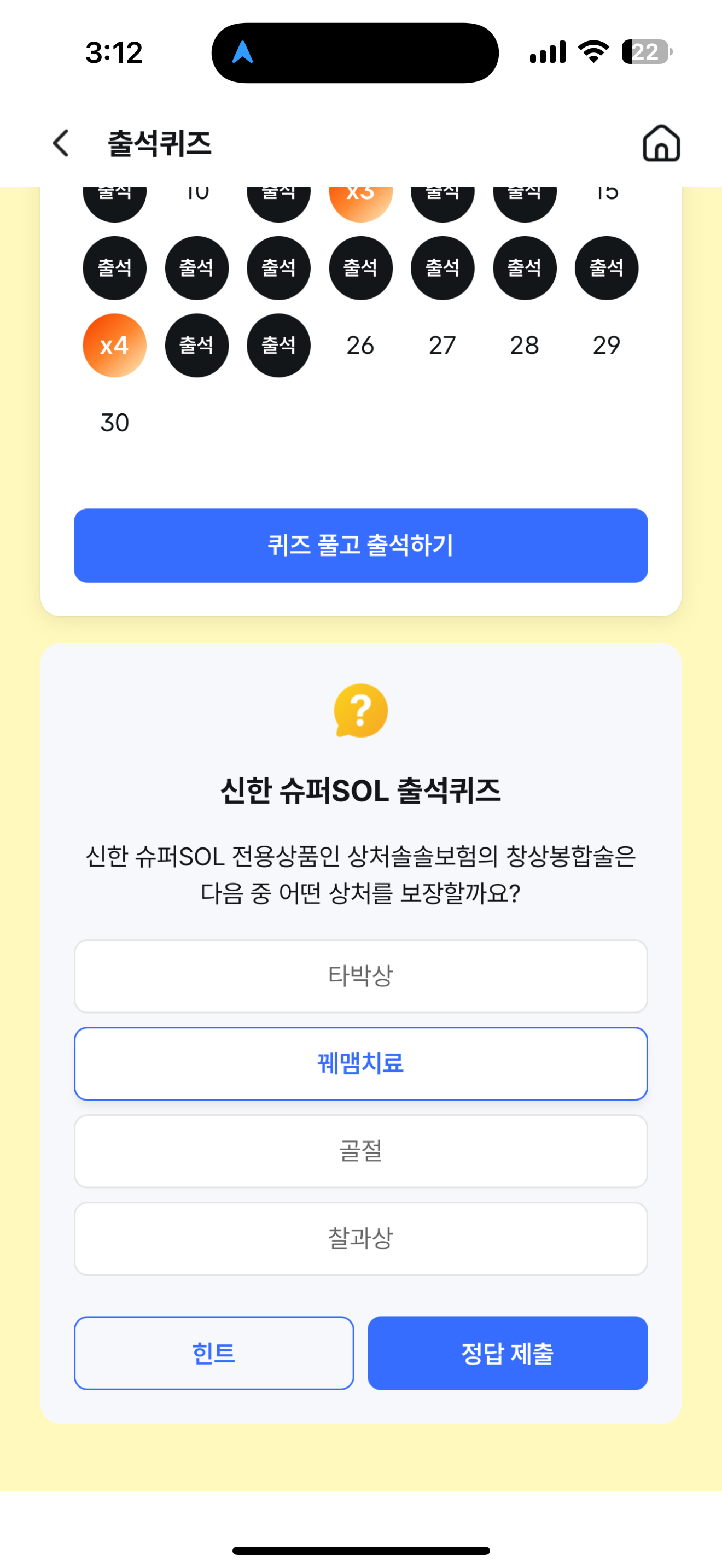 신한 슈퍼SOL 출석퀴즈 정답은 꿰맴치료 입니다