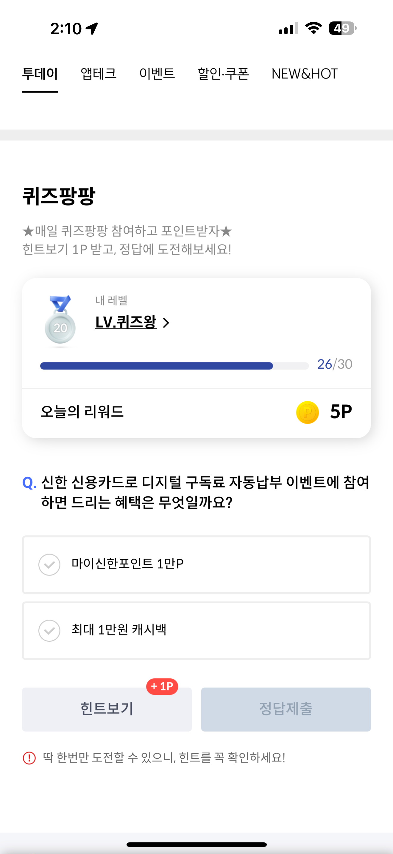 신한카드 퀴즈팡팡 정답은 최대 1만원 캐시백 입니다