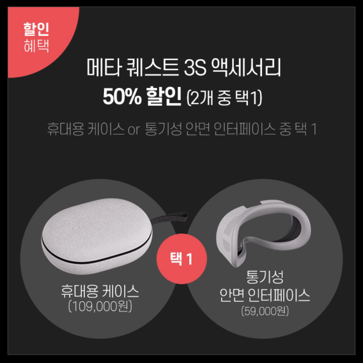 메타퀘스트3S 액세서리인 휴대용 케이스, 통기성 안면 인터페이스 둘 중 하나를 50% 할인 받아 구입할 수 있습니다. 꼭 필요한 액세서리이니 저렴하게 득템할 수 있습니다.