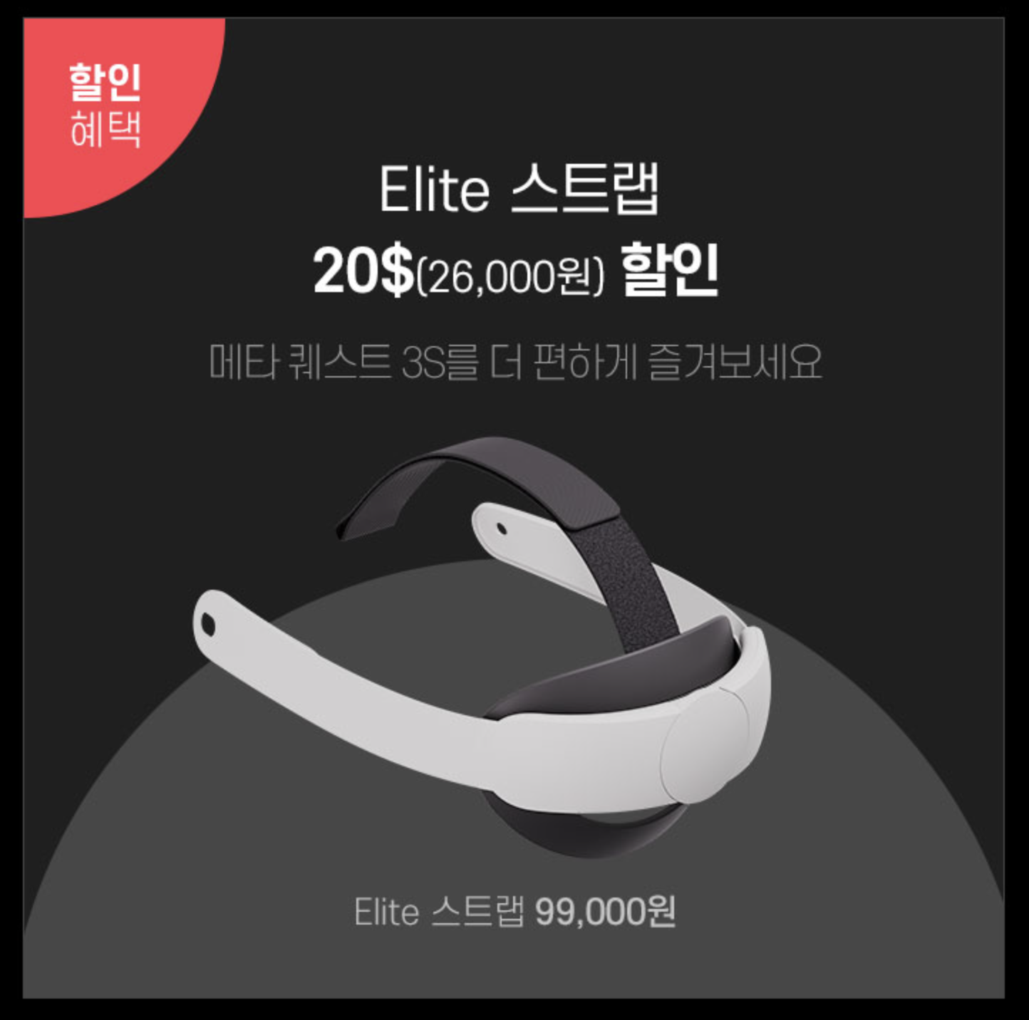 메타퀘스트3S를 머리에 편하게 착용할 수 있는 99,000원의 엘리트 스트랩을 26,000원 할인 받아 구입할 수 있습니다.