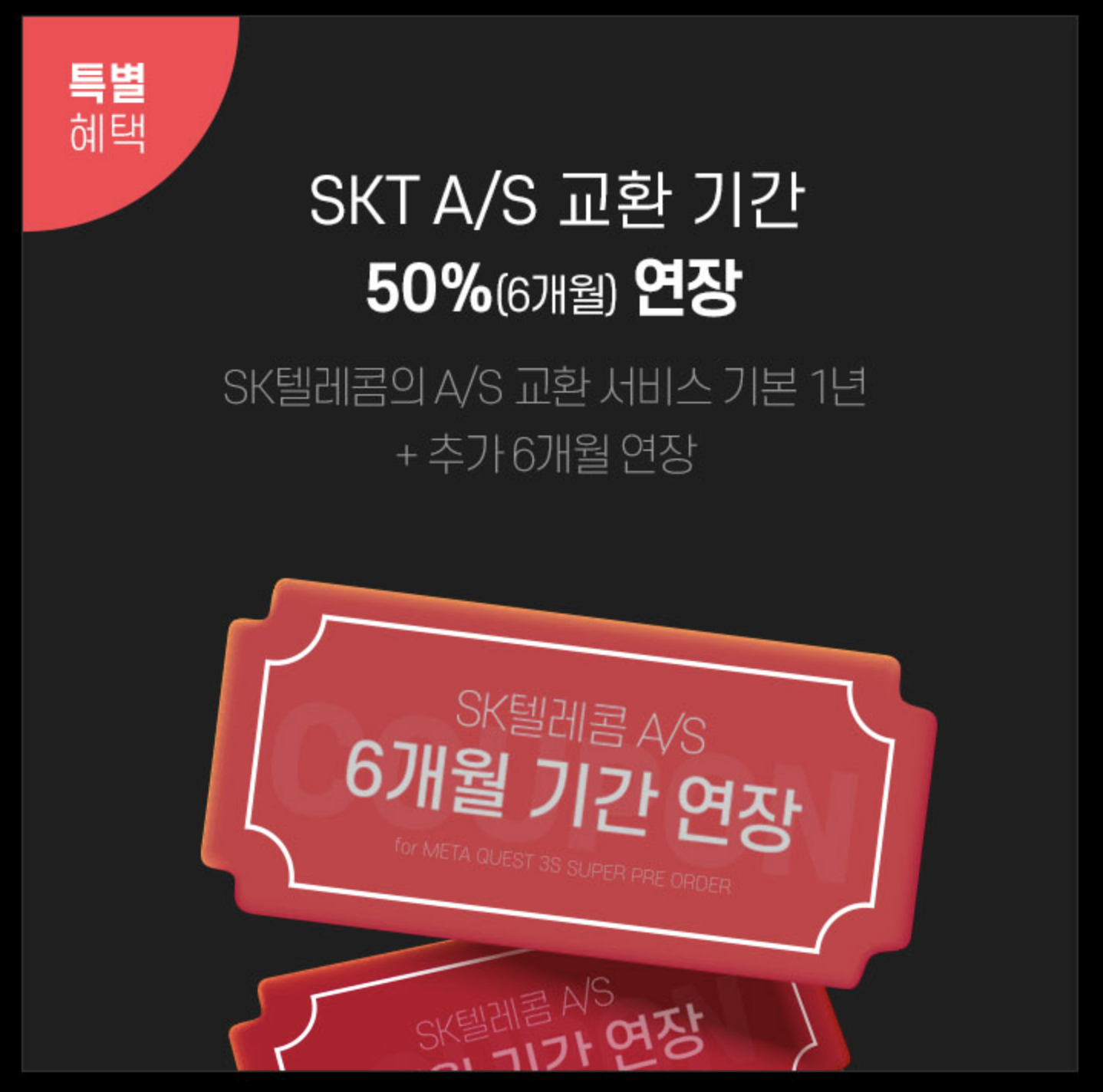 11번가에서 메타퀘스트3S를 사전예약으로 구입하면 SK텔레콤 A/S 교환서비스 1년 기본에 추가적으로 6개월 연장 혜택이 제공됩니다. 1년 6개월간 안심하고 사용할 수 있습니다.