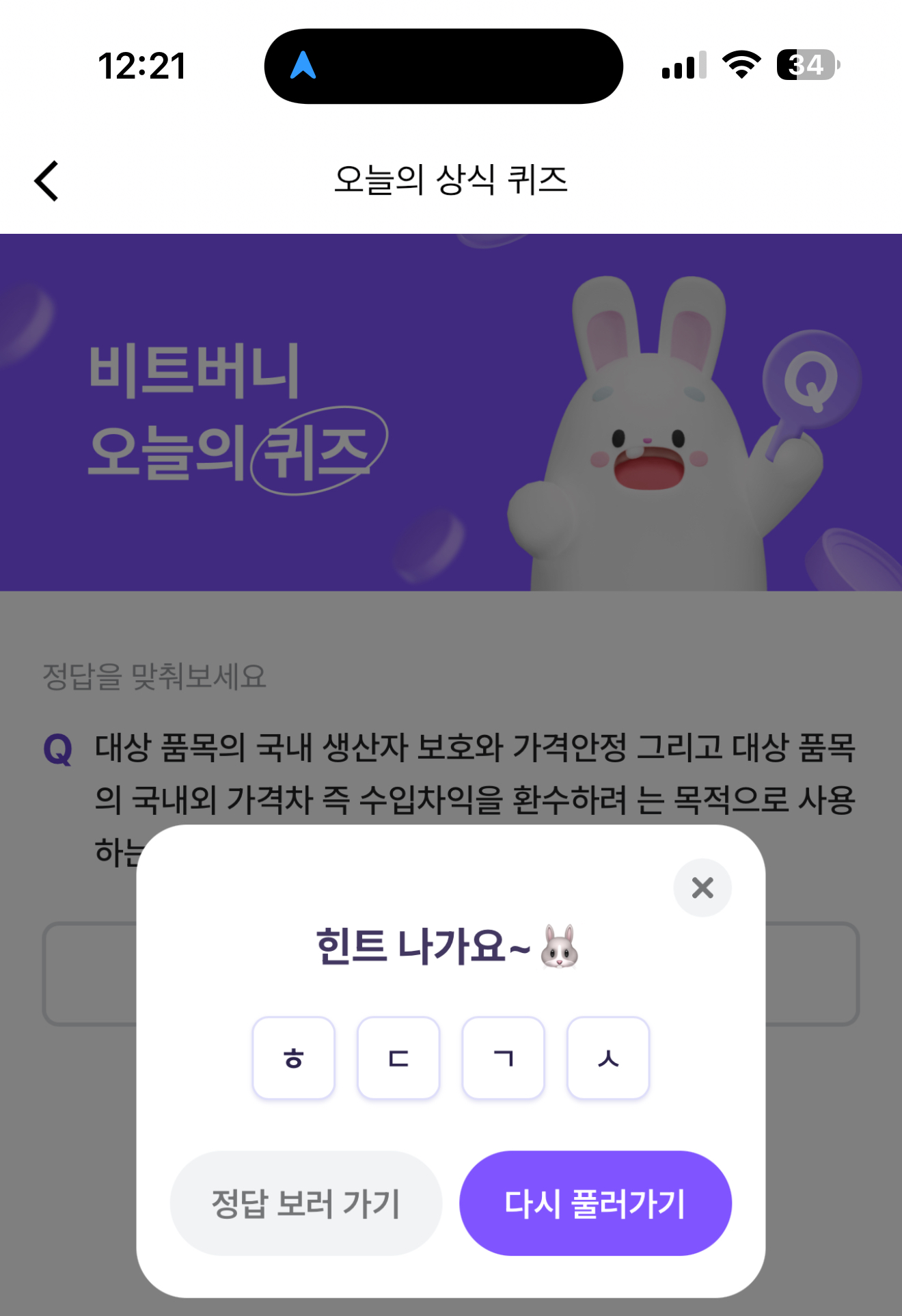 비트버니 오늘의 퀴즈 초성힌트는 ㅎㄷㄱㅅ 입니다