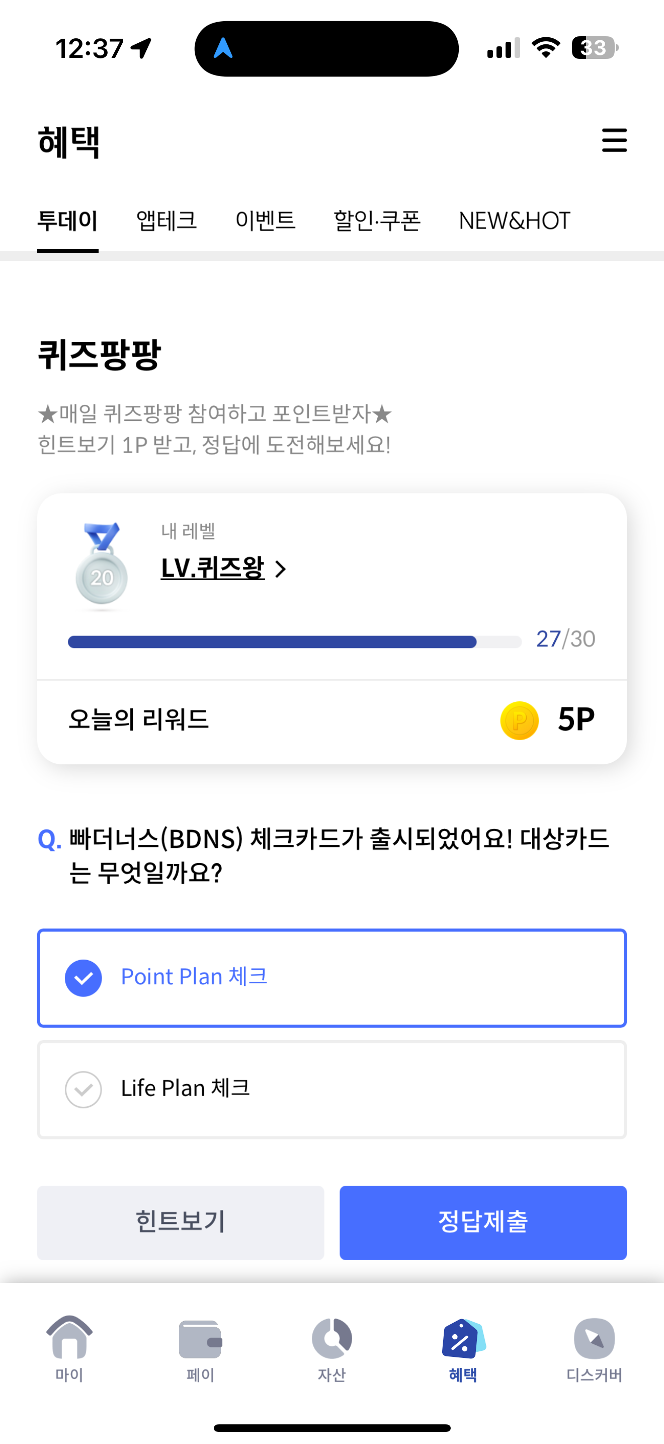 신한카드 퀴즈팡팡 정답은 Point Plan 체크 입니다