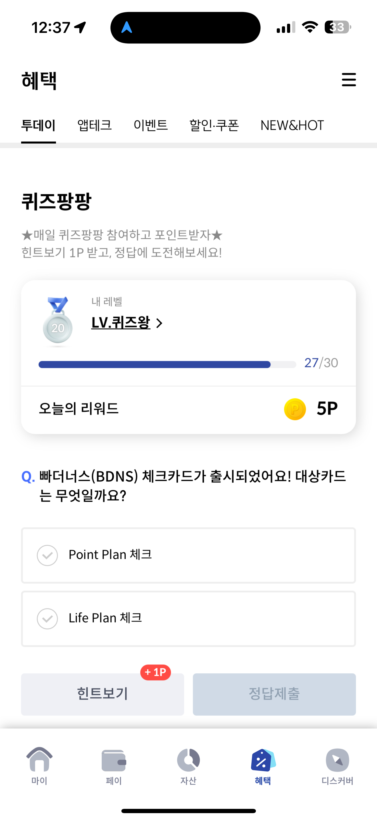 신한카드 퀴즈팡팡 정답은 Point Plan 체크 입니다