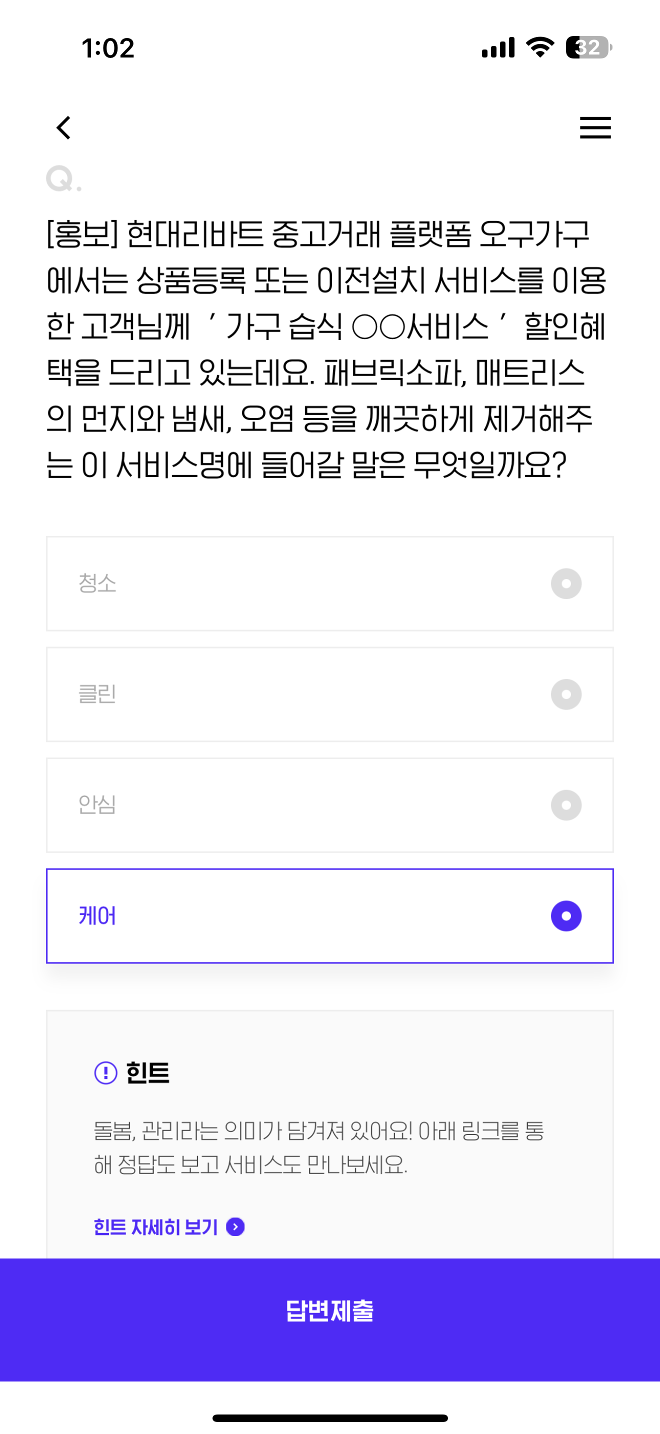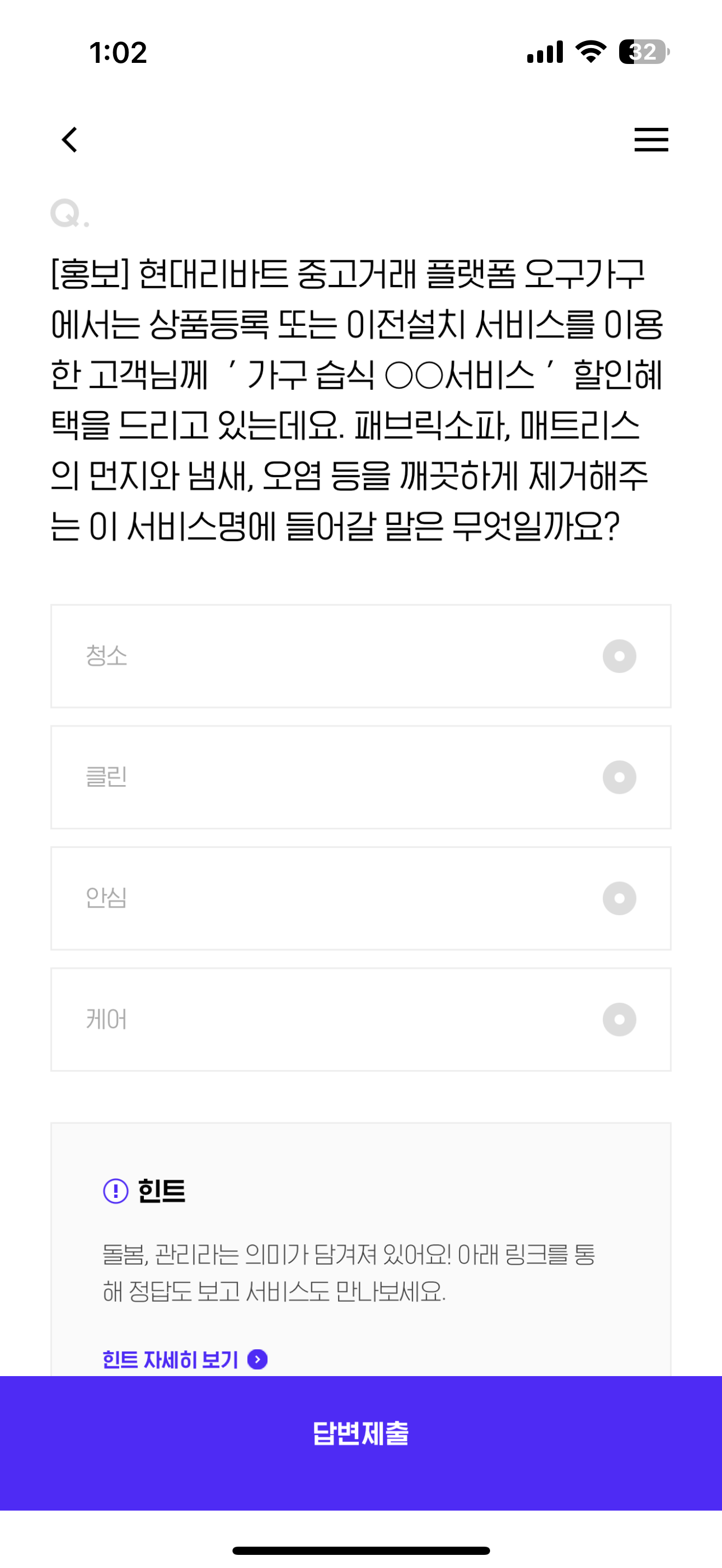 현대리바트 중고거래 플랫폼 오구가구에서는 상품등록 또는 이전설치 서비스를 이용한 고객님께 ' 가구 습식 OO서비스 ' 할인혜택을 드리고 있는데요. 패브릭소파, 매트리스의 먼지와 냄새, 오염 등을 깨끗하게 제거해주는 이 서비스명에 들어갈 말은 무엇일까요? 보기는 1. 청소 2. 클린 3. 안심 4. 케어 입니다.