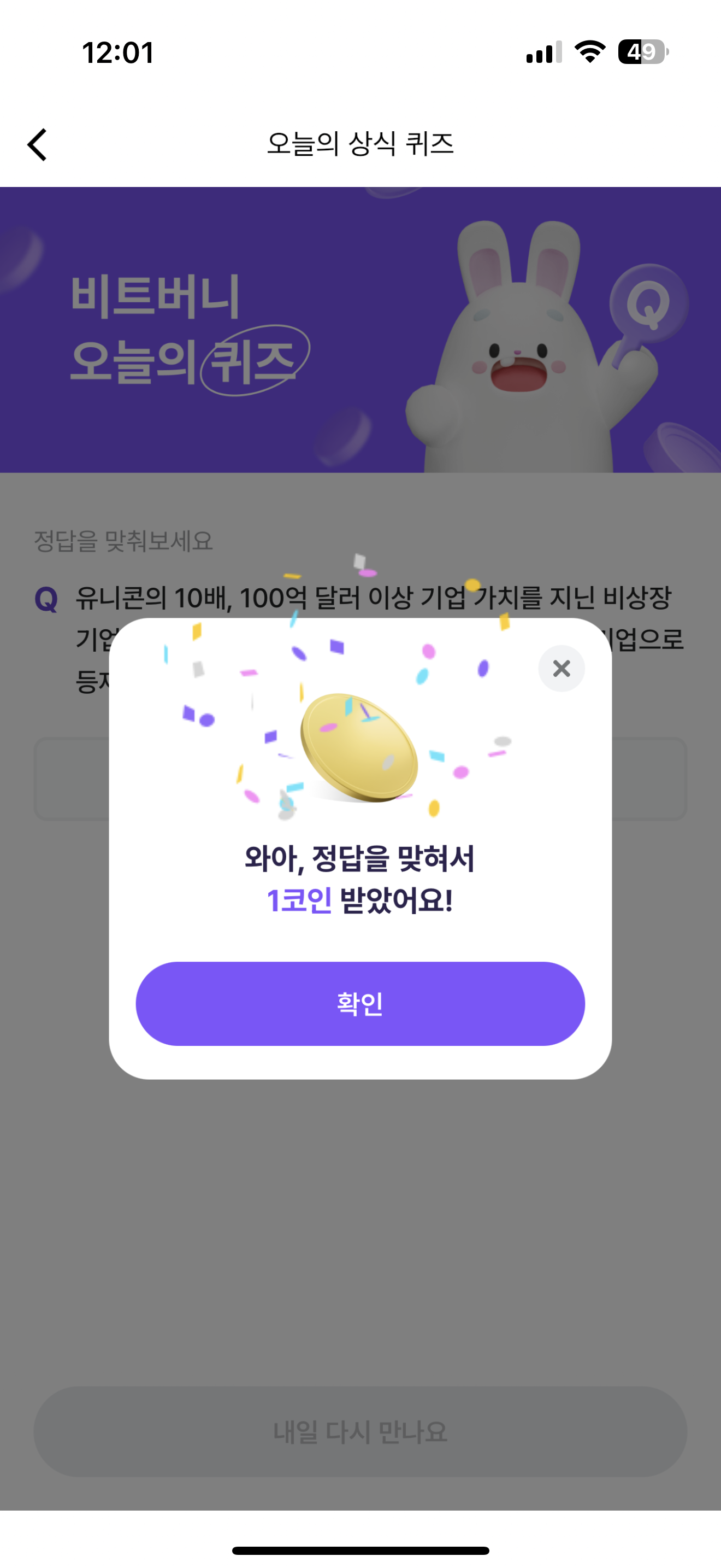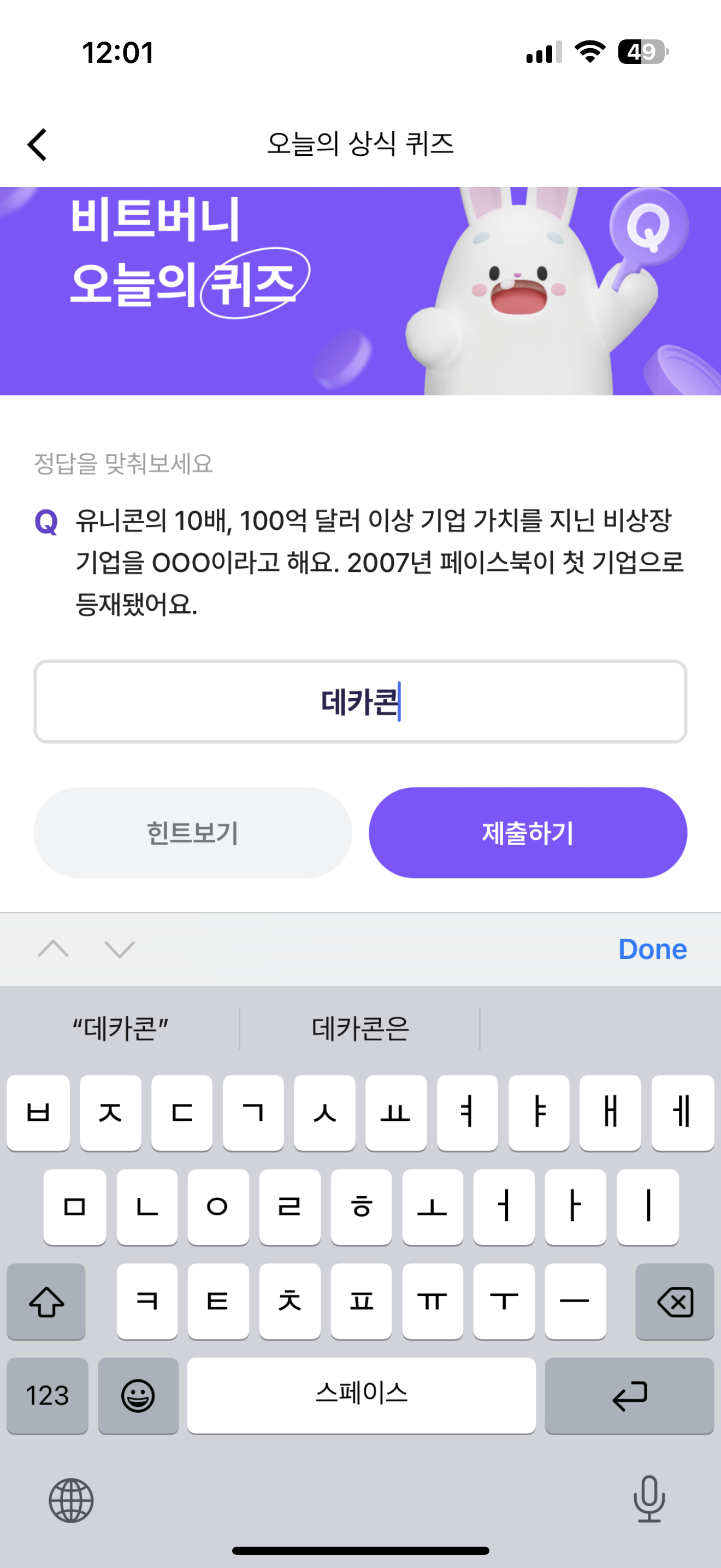 비트버니 오늘의 퀴즈 10월 1일 ㄷㅋㅋ정답(유니콘의 10배, 100억 달러 이상 기업 가치를 지닌 비상장 기업을 OOO이라고 해요. 2007년 페이스북이 첫 기업으로 등재됐어요)