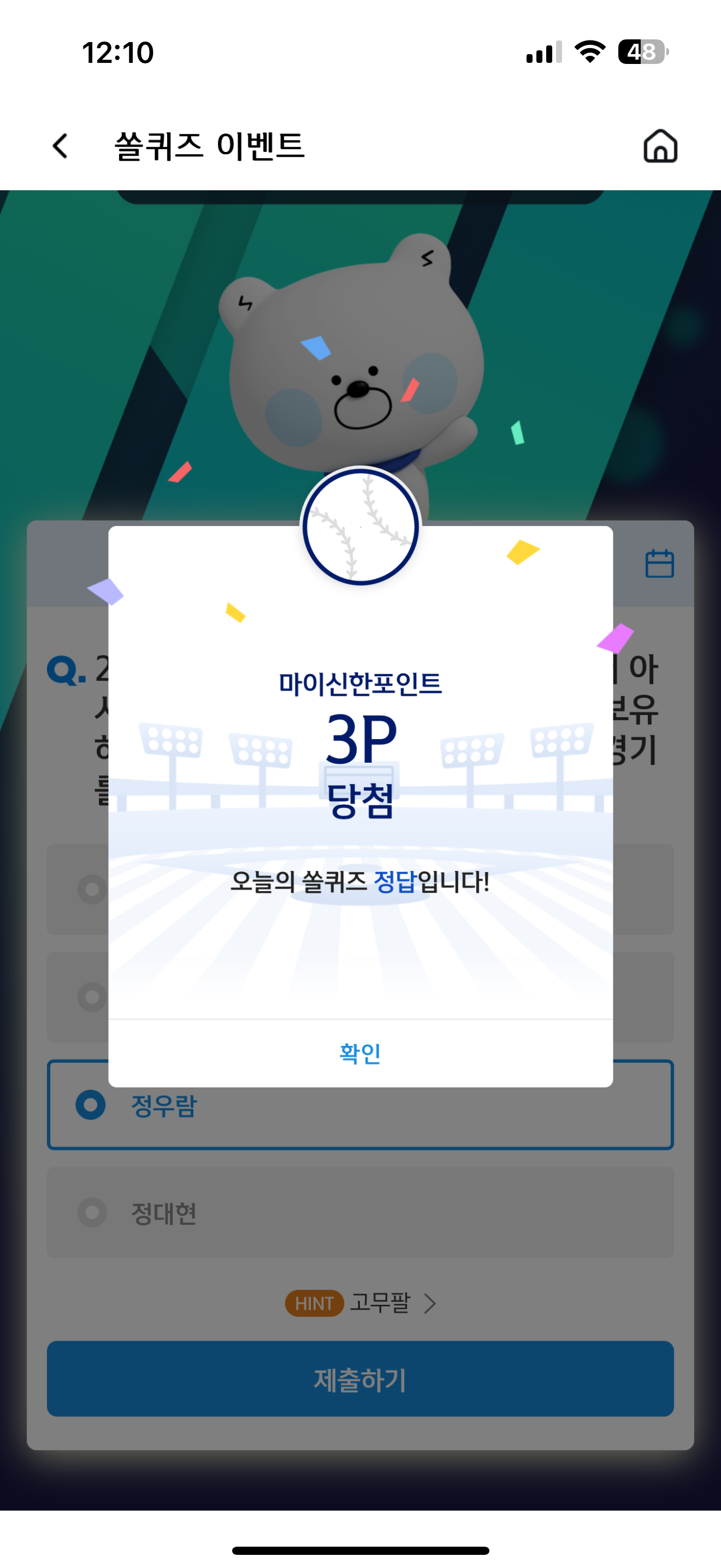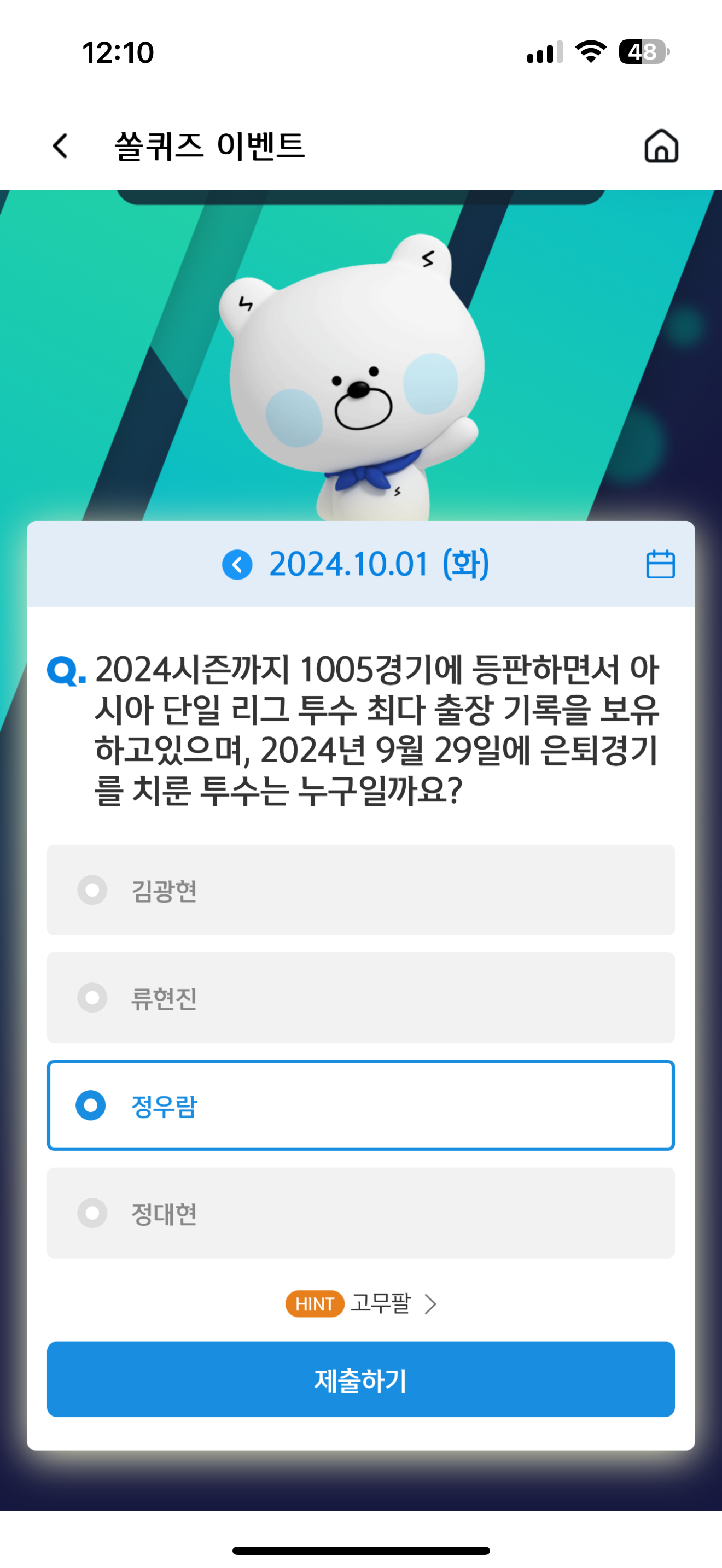 신한 슈퍼SOL 야구/상식 쏠퀴즈 정답은 정우람 입니다