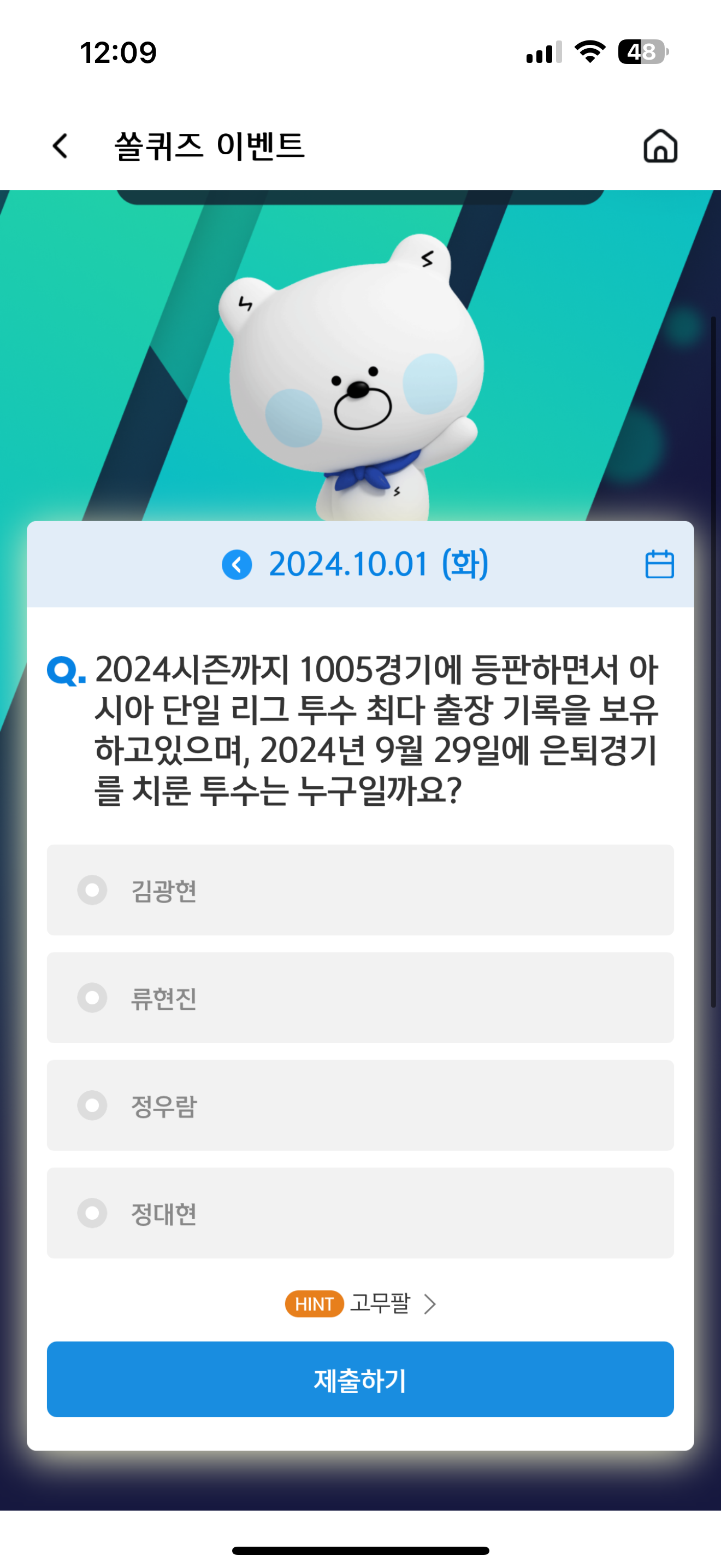 신한 슈퍼SOL 야구/상식 쏠퀴즈 10월 1일 문제입니다