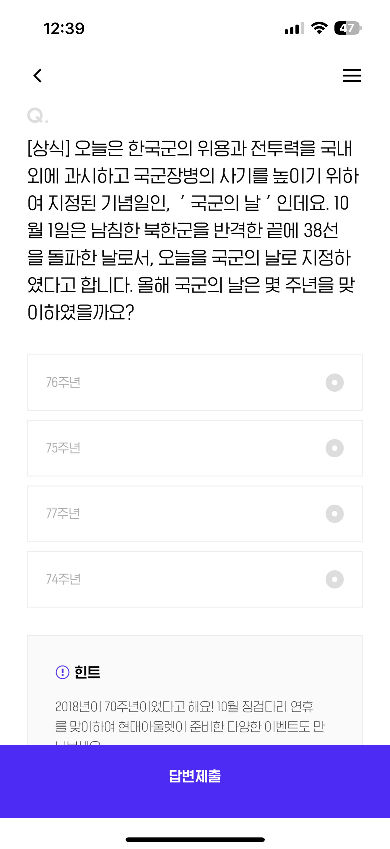 오늘은 한국군의 위용과 전투력을 국내 외에 과시하고 국군장병의 사기를 높이기 위하여 지정된 기념일인, ' 국군의 날 ' 인데요. 10월 1일은 남침한 북한군을 반격한 끝에 38선을 돌파한 날로서, 오늘을 국군의 날로 지정하였다고 합니다. 올해 국군의 날은 몇 주년을 맞이하였을까요? 보기는 1. 76주년 2. 75주년 3. 77주년 4. 74주년 입니다