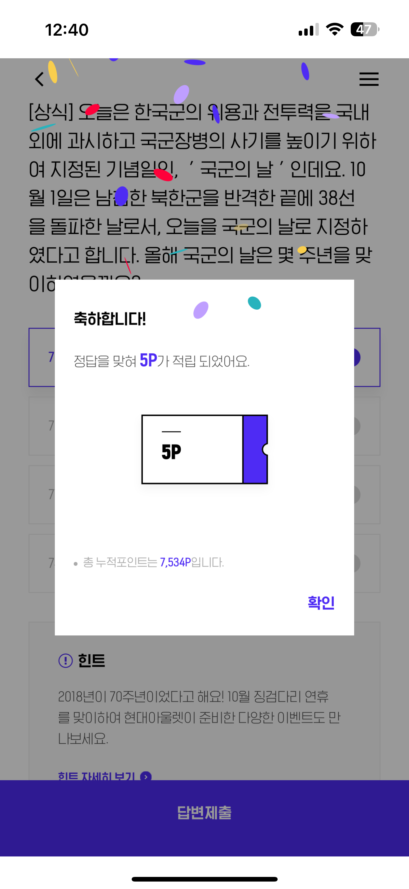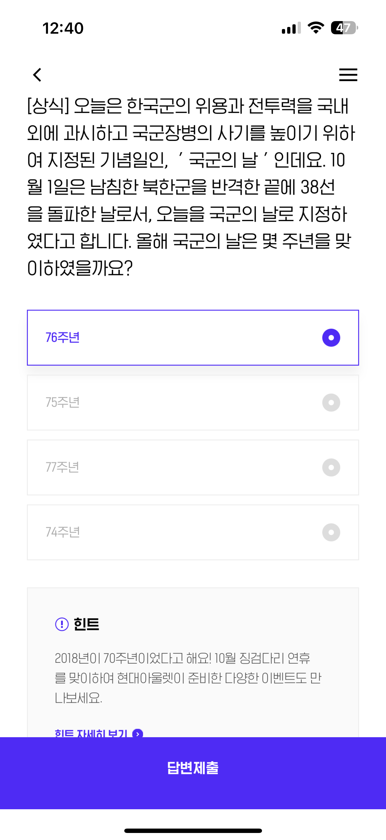 H포인트 퀴즈 정답은 76주년 입니다