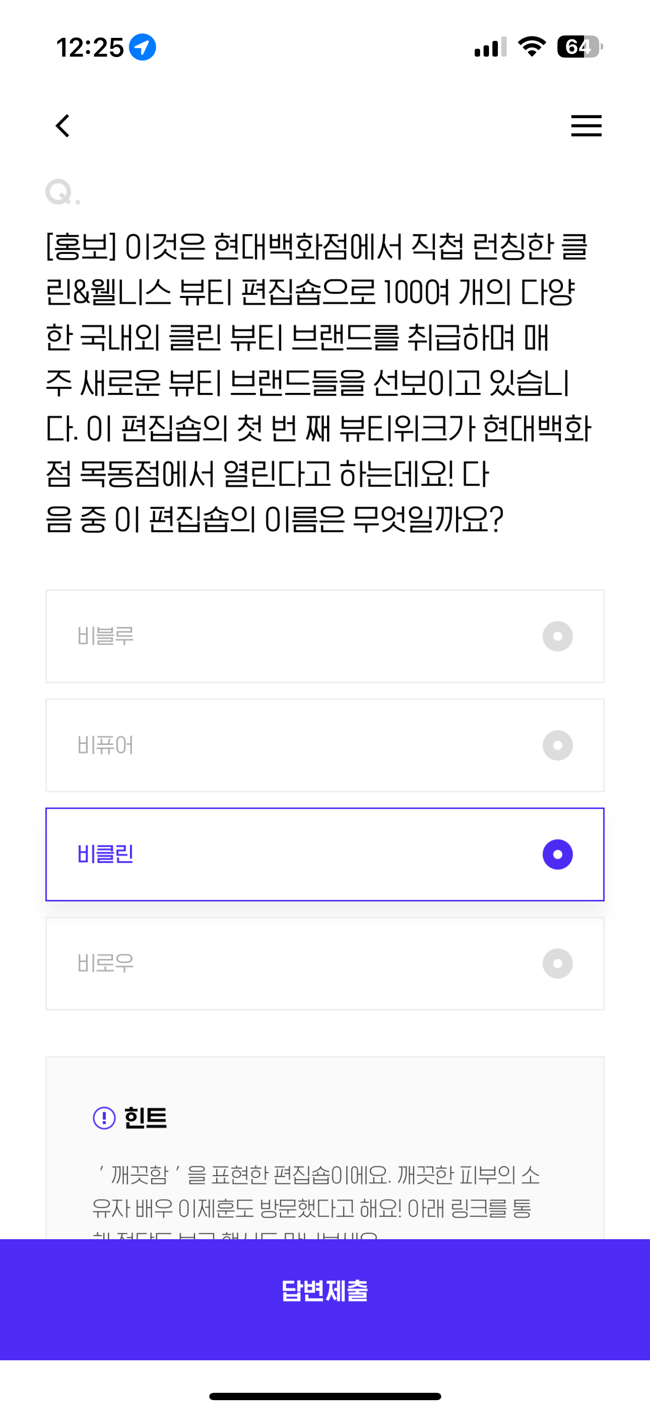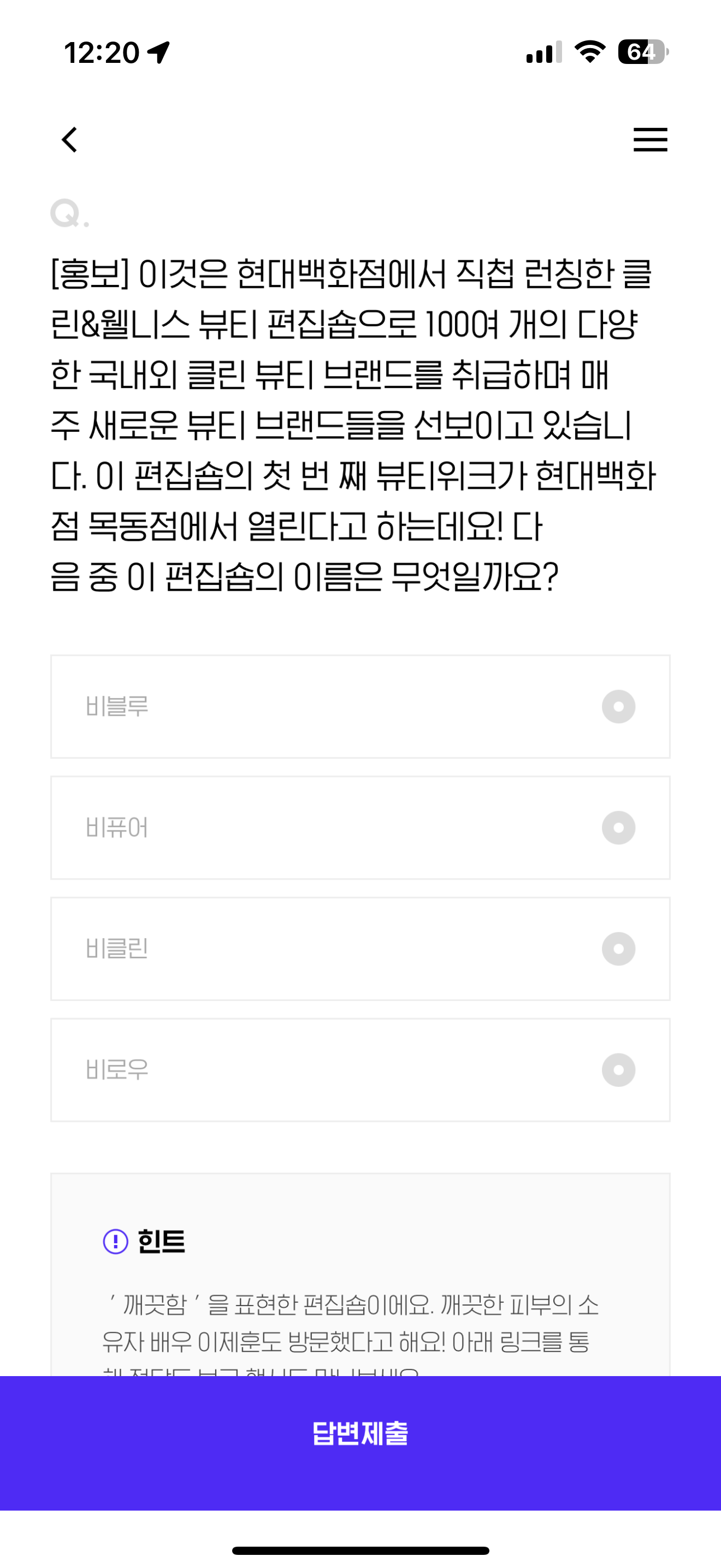 이것은 현대백화점에서 직접 런칭한 클린&웰니스 뷰티 편집숍으로 100여 개의 다양한 국내외 클린 뷰티 브랜드를 취급하며 매주 새로운 뷰티 브랜드들을 선보이고 있습니다. 이 편집숍의 첫 번 째 뷰티위크가 현대백화점 목동점에서 열린다고 하는데요! 다음 중 이 편집숍의 이름은 무엇일까요? 보기는 1. 비블루 2. 비퓨어 3. 비클린 4. 비로우 입니다.